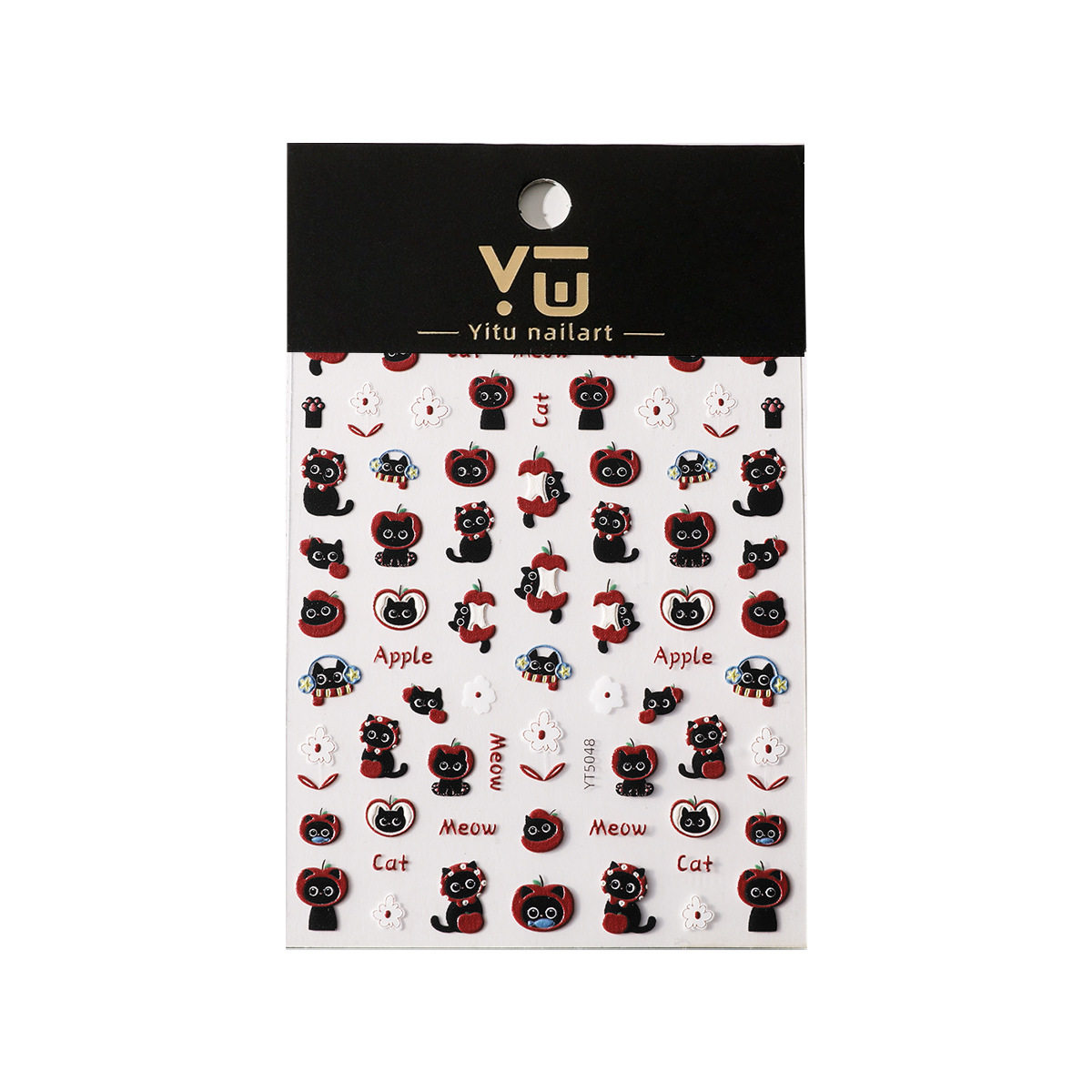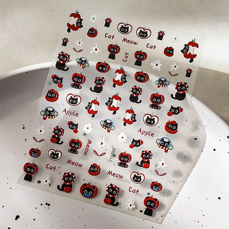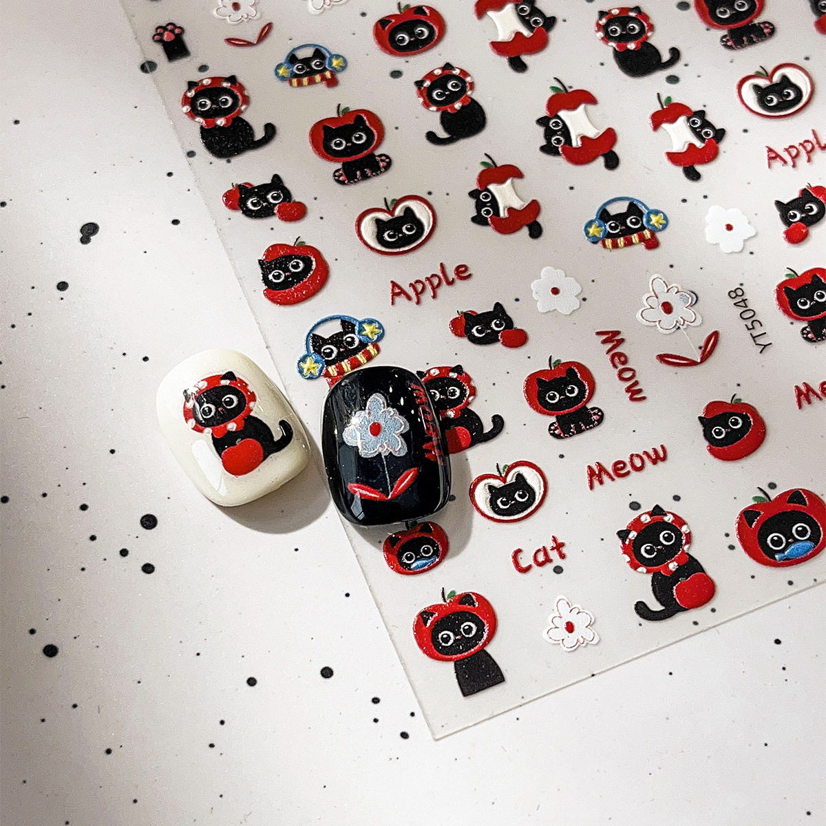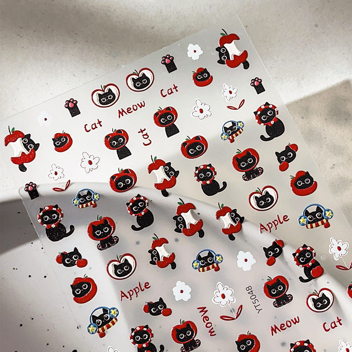 红苹果小黑猫浮雕美甲贴纸甜酷