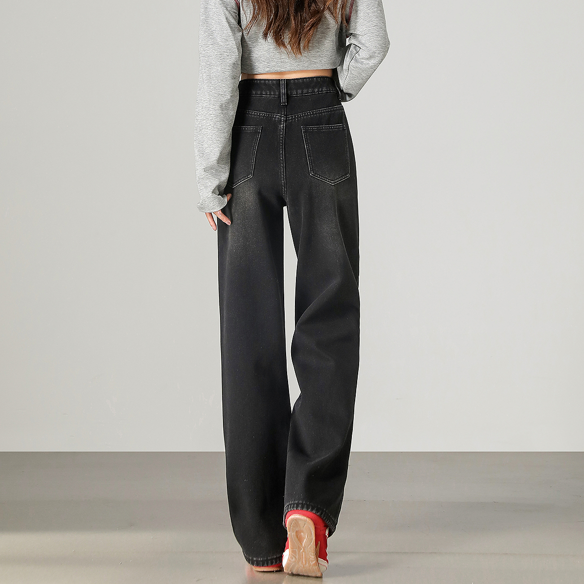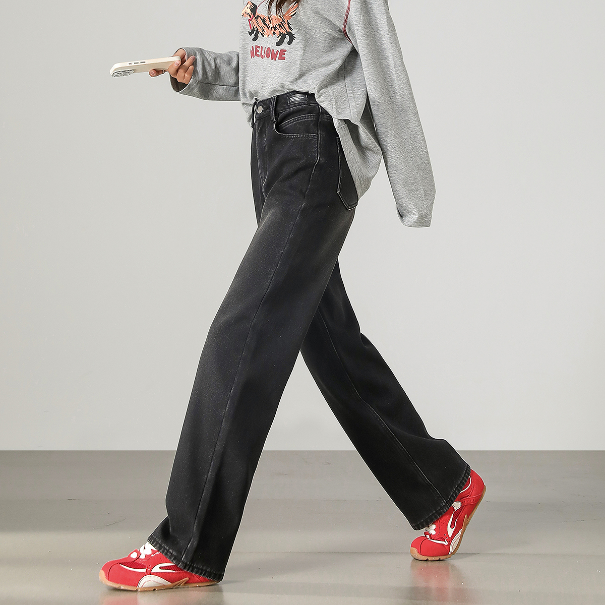 唐狮2025秋冬季直筒牛仔长裤女基础百搭加绒加厚显瘦碳黑色高级感