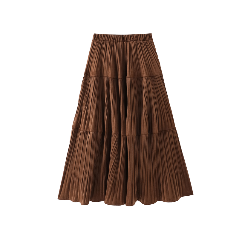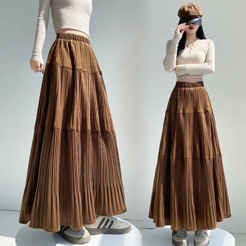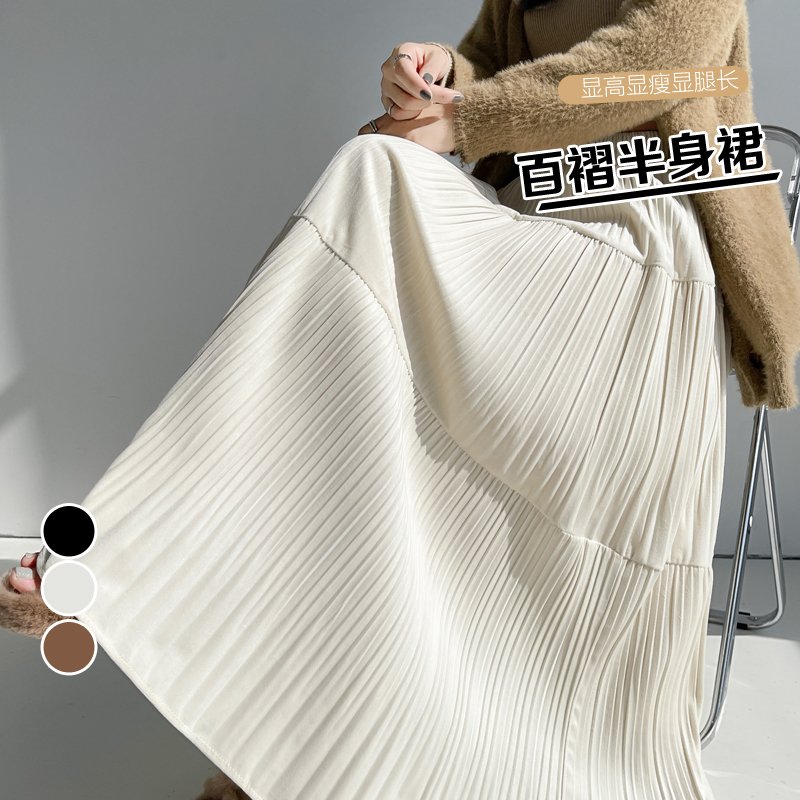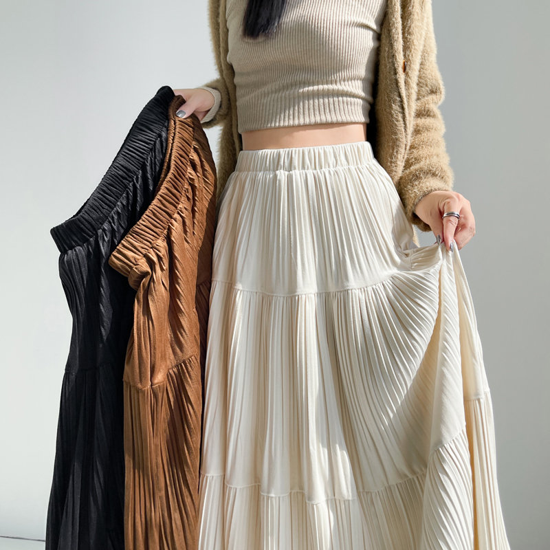 LingFei 米白色丝绒蛋糕裙半身裙女秋冬高腰显瘦压褶a字大摆长裙