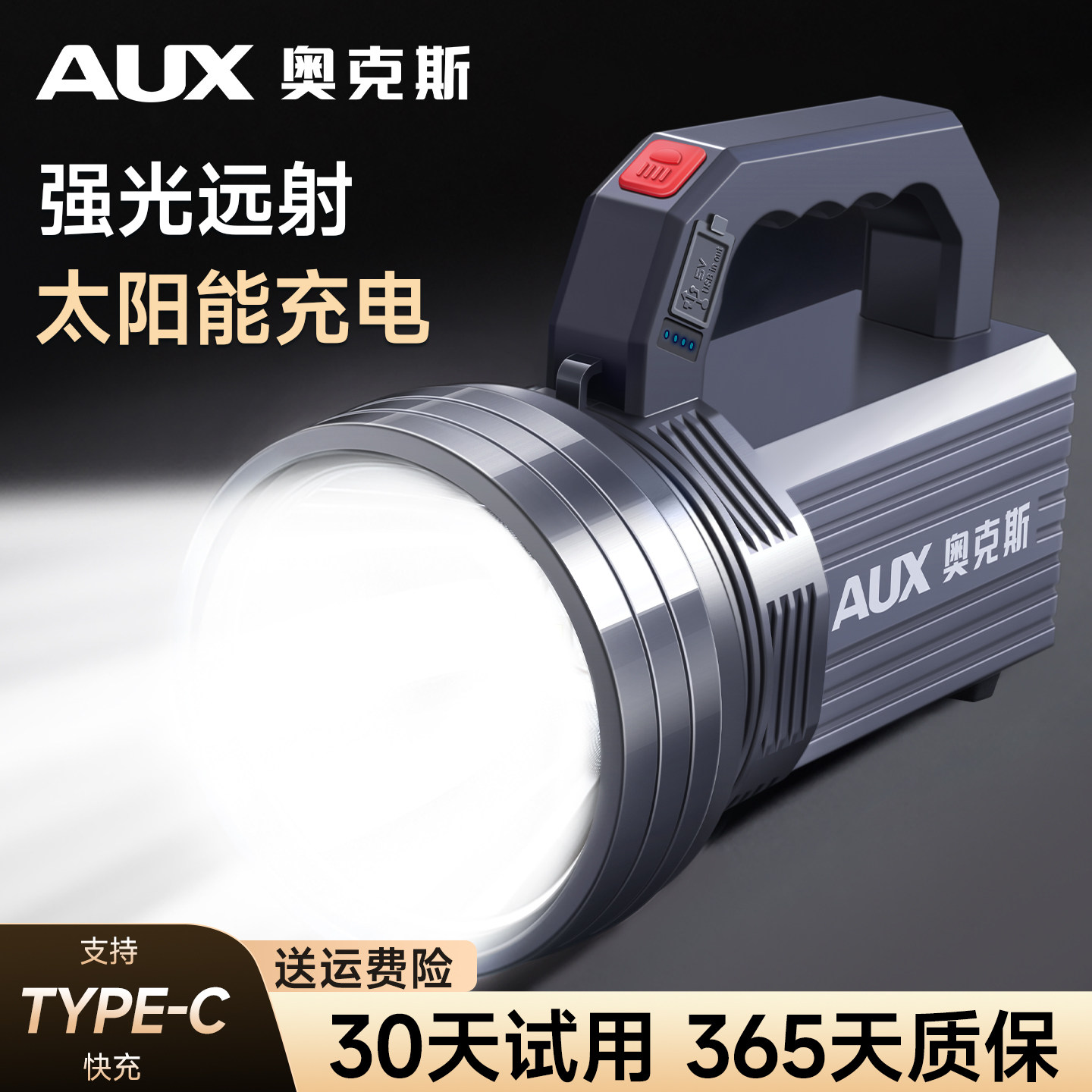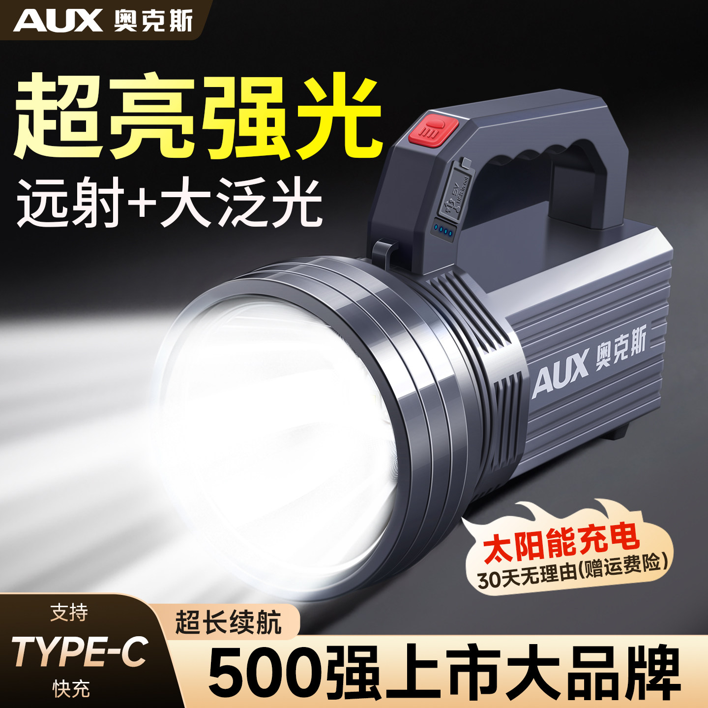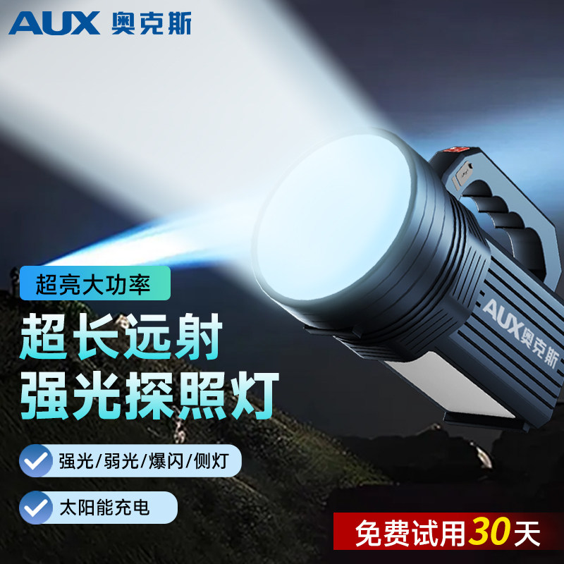 奥克斯强光手提探照灯太阳能手电筒长续航大容量应急停电家用户外