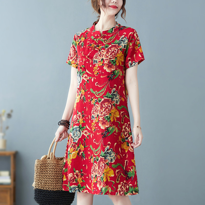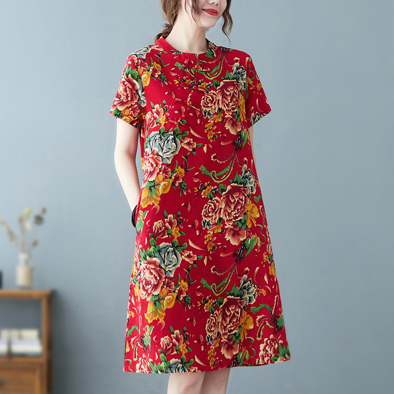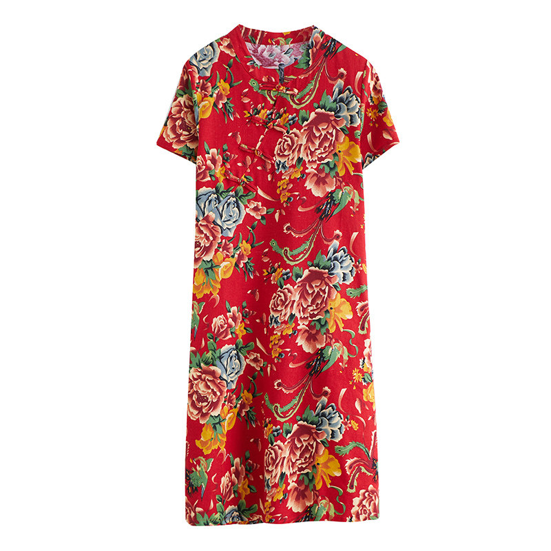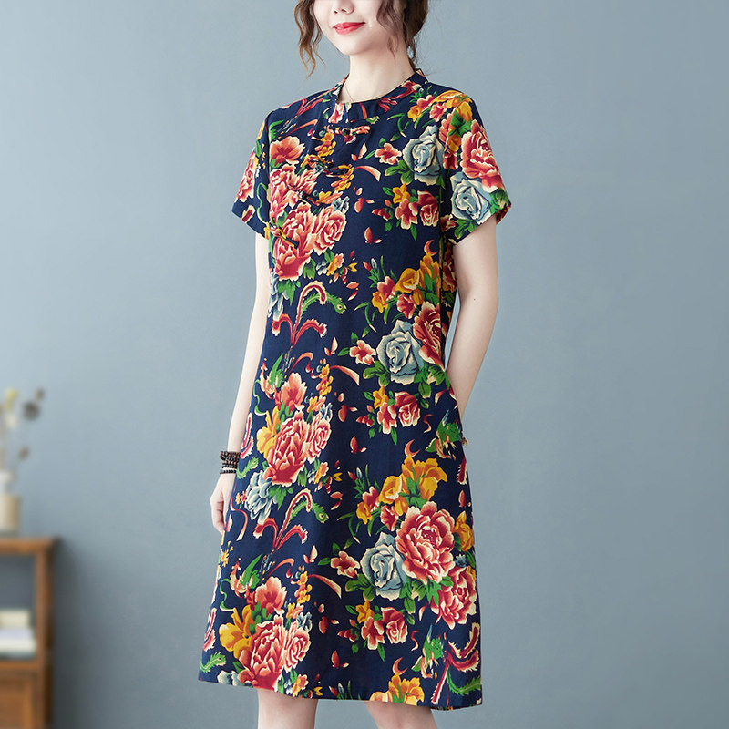 东北大花新款复古减龄民族风麻棉透气短袖旗袍连衣裙女圆领短袖潮