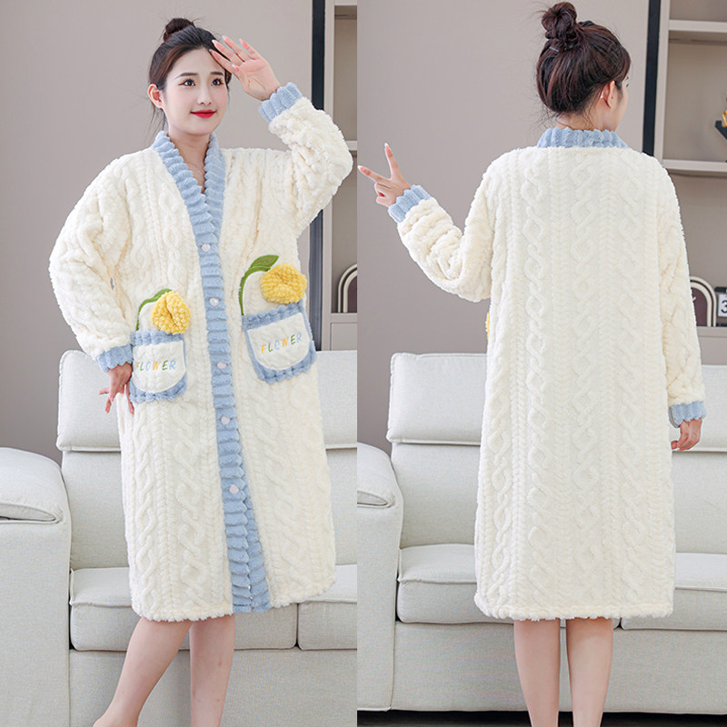 2025卡通中长款加绒睡衣女冬季珊瑚绒睡袍大码宽松可外穿保暖浴衣