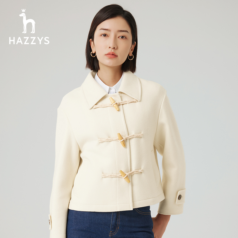 Hazzys哈吉斯短款牛角羊毛大衣女春秋时尚宽松休闲纯色毛呢外套潮
