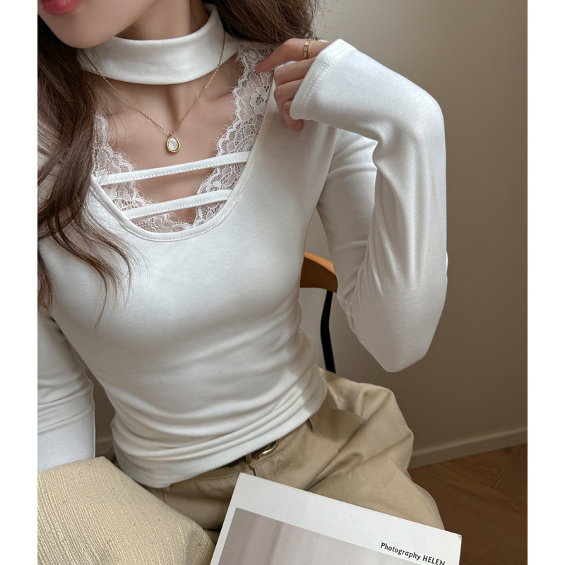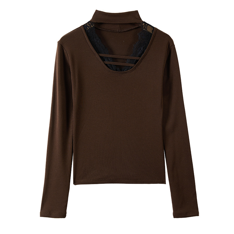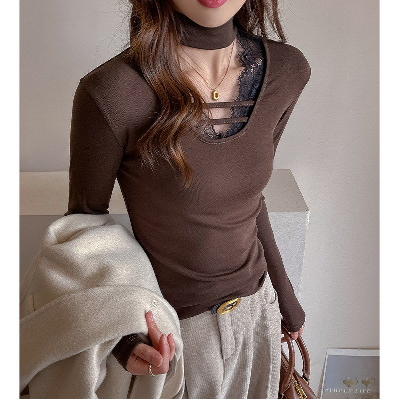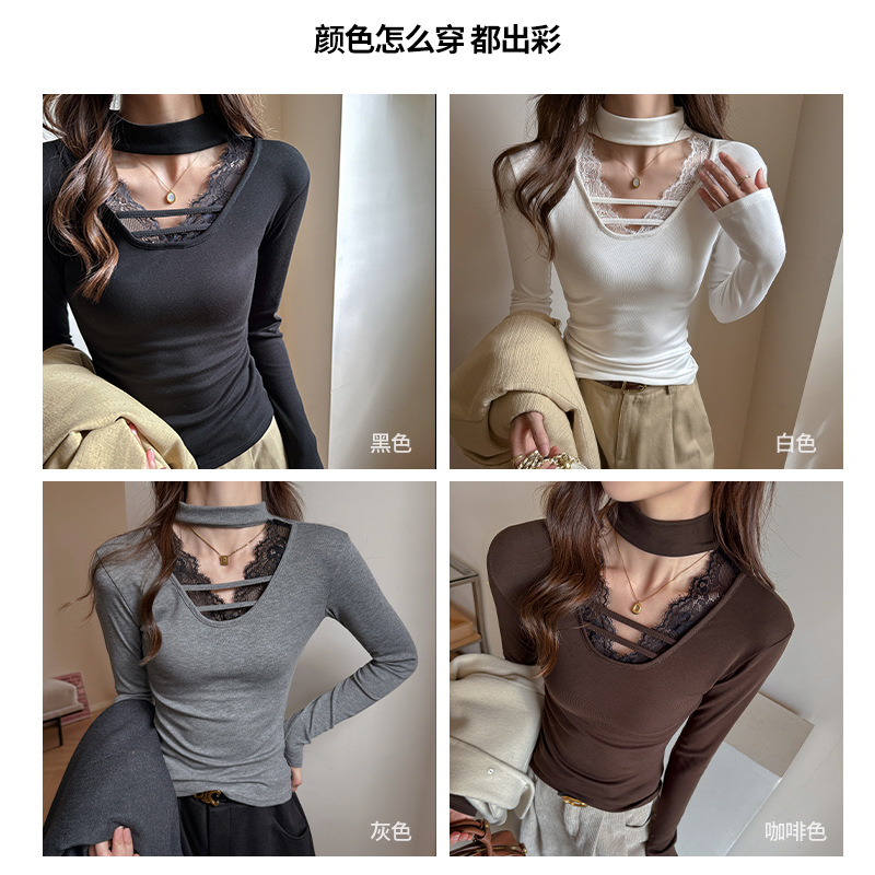 严选秋冬季磨毛打底衫女v领蕾丝拼接修身显瘦高级感内搭长袖t恤
