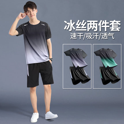 运动套装男跑步速干衣夏季冰丝T恤短袖短裤羽毛球篮球服健身衣服