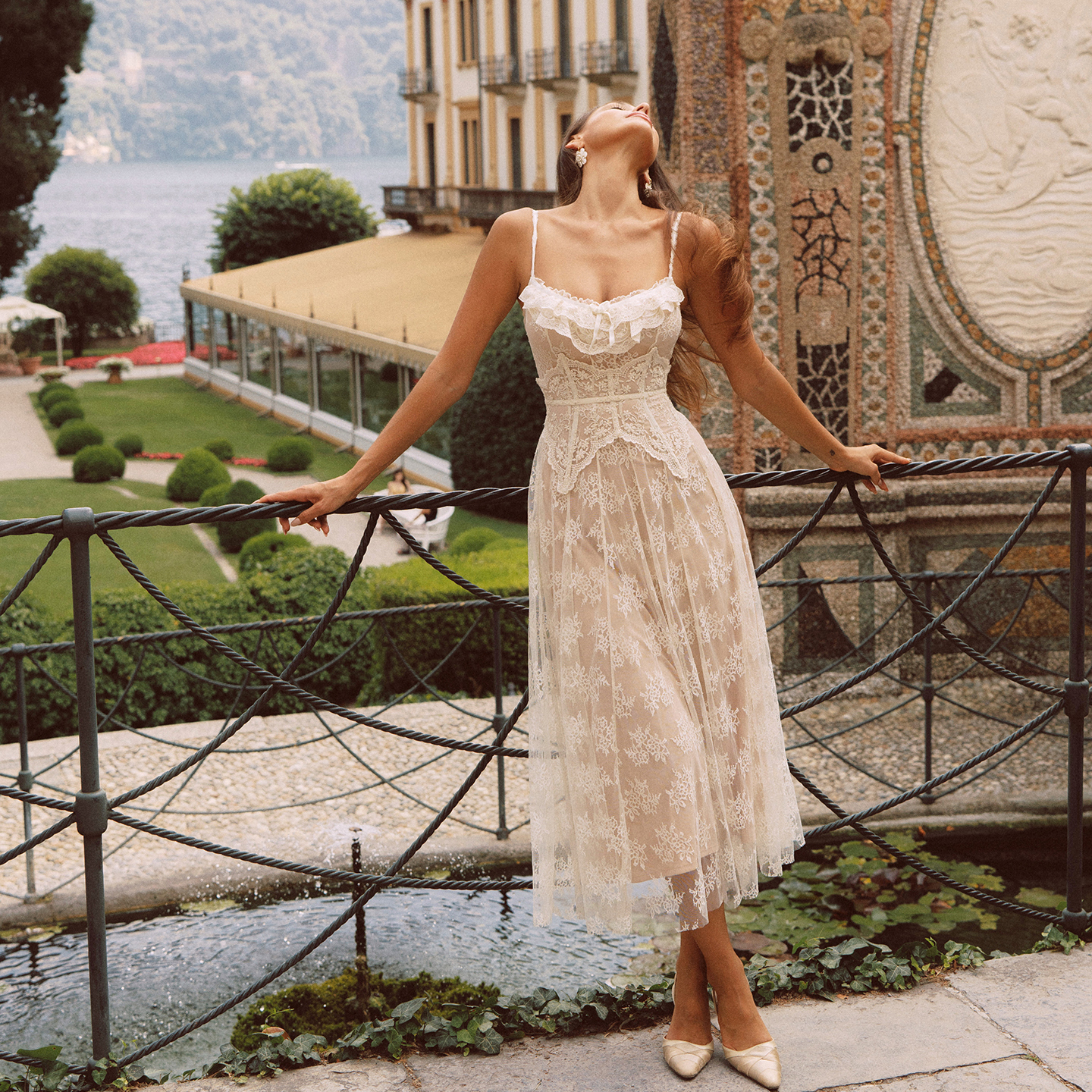 LaceMade 蕾丝花束 法式千金风收腰显瘦吊带蕾丝白色长款连衣裙女