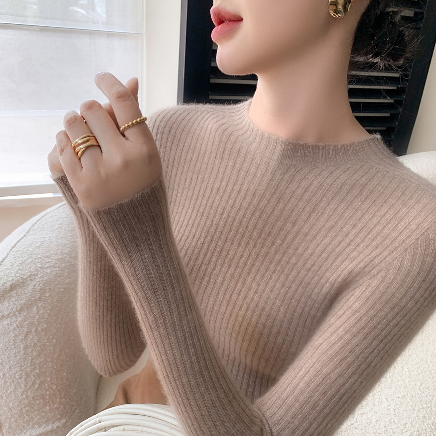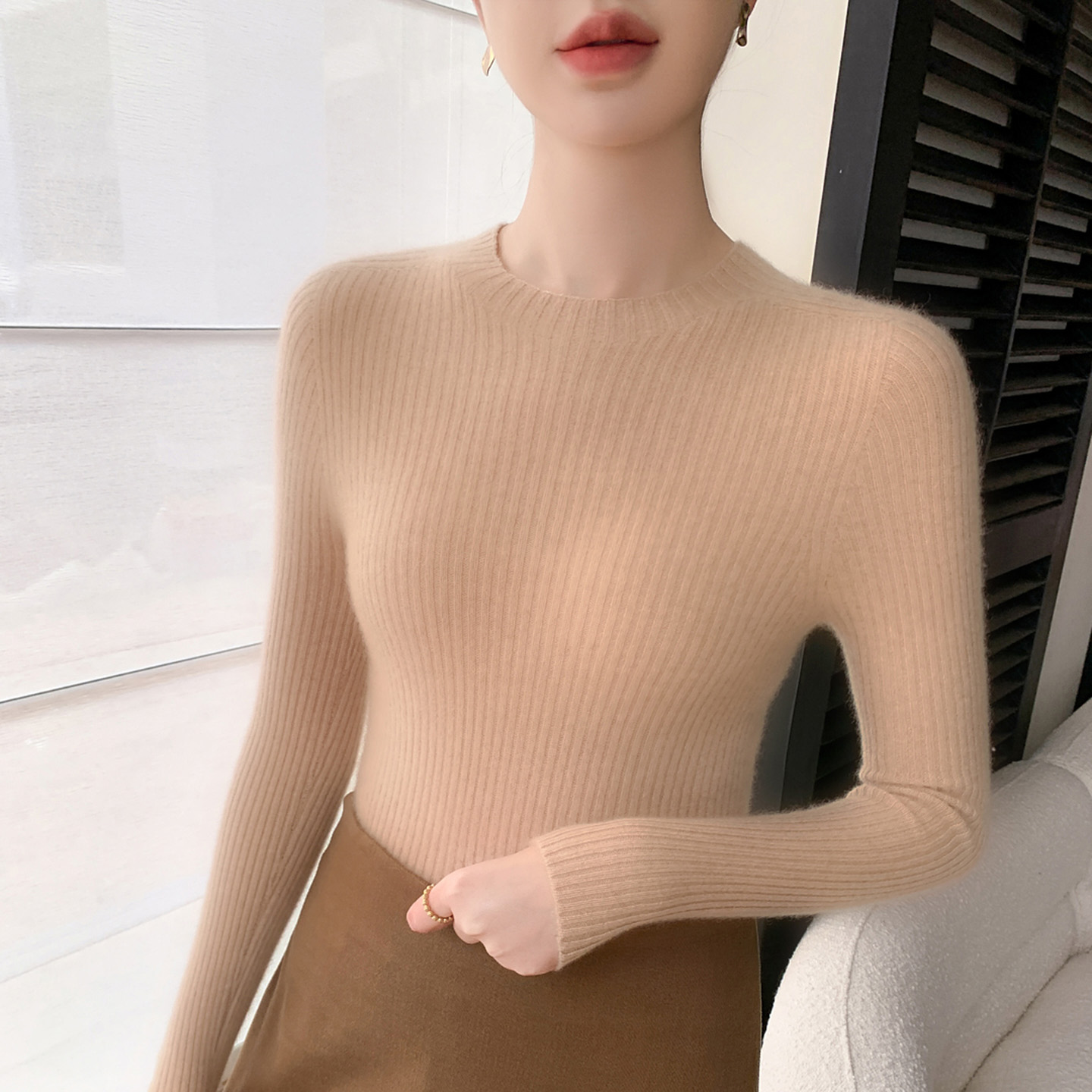 圆领抽条羊绒衫女2025新款纯色羊毛毛衣短款套头修身打底针织内搭