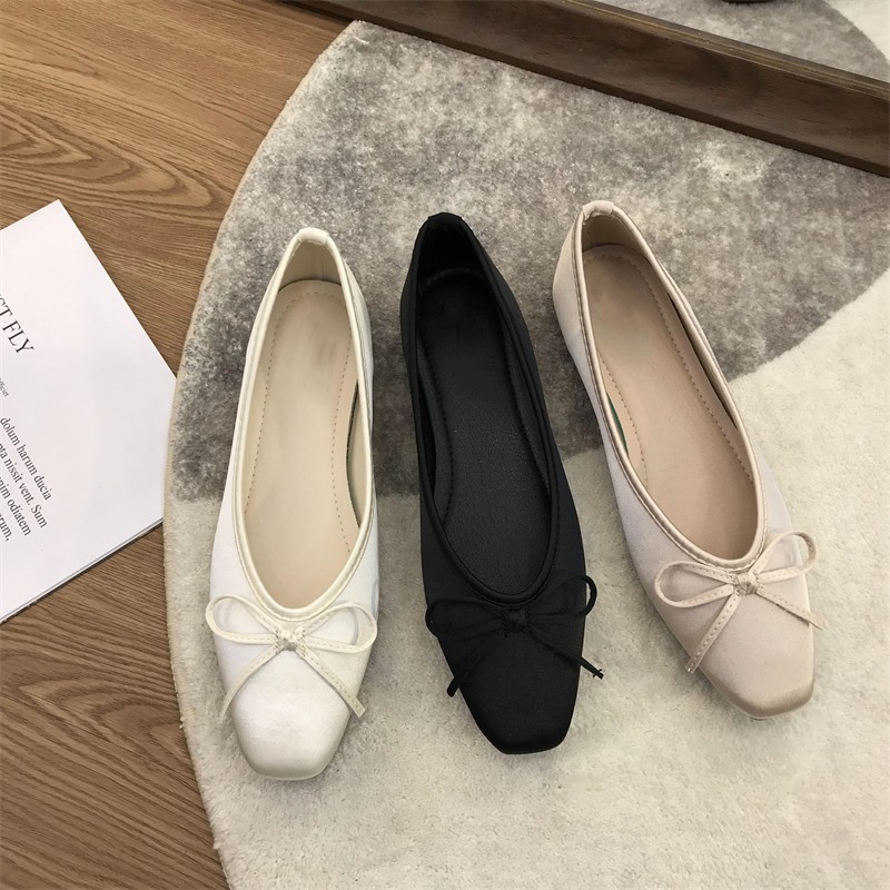 香槟色蝴蝶结方头浅口平底单鞋女2025年春季新款温柔绸缎面奶奶鞋