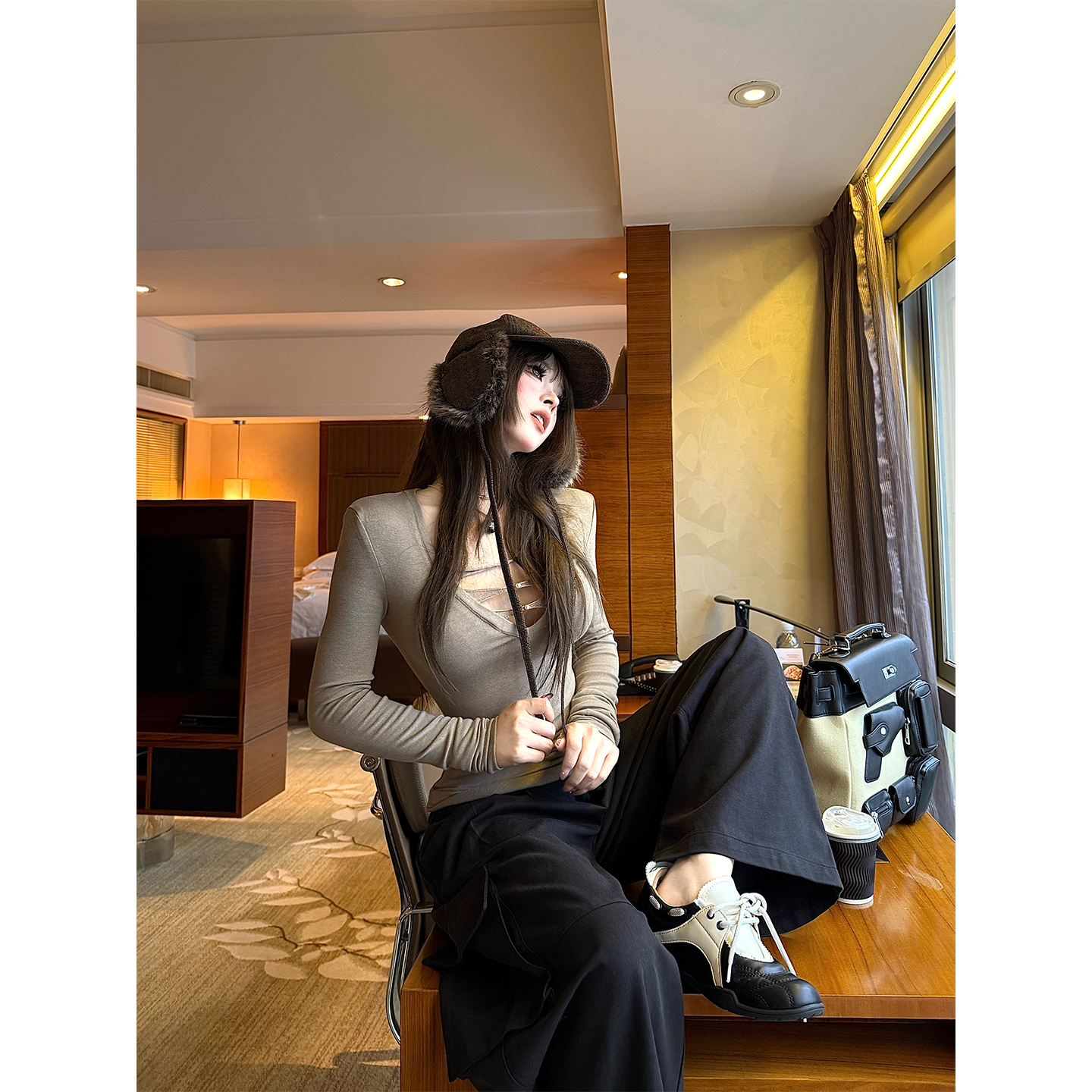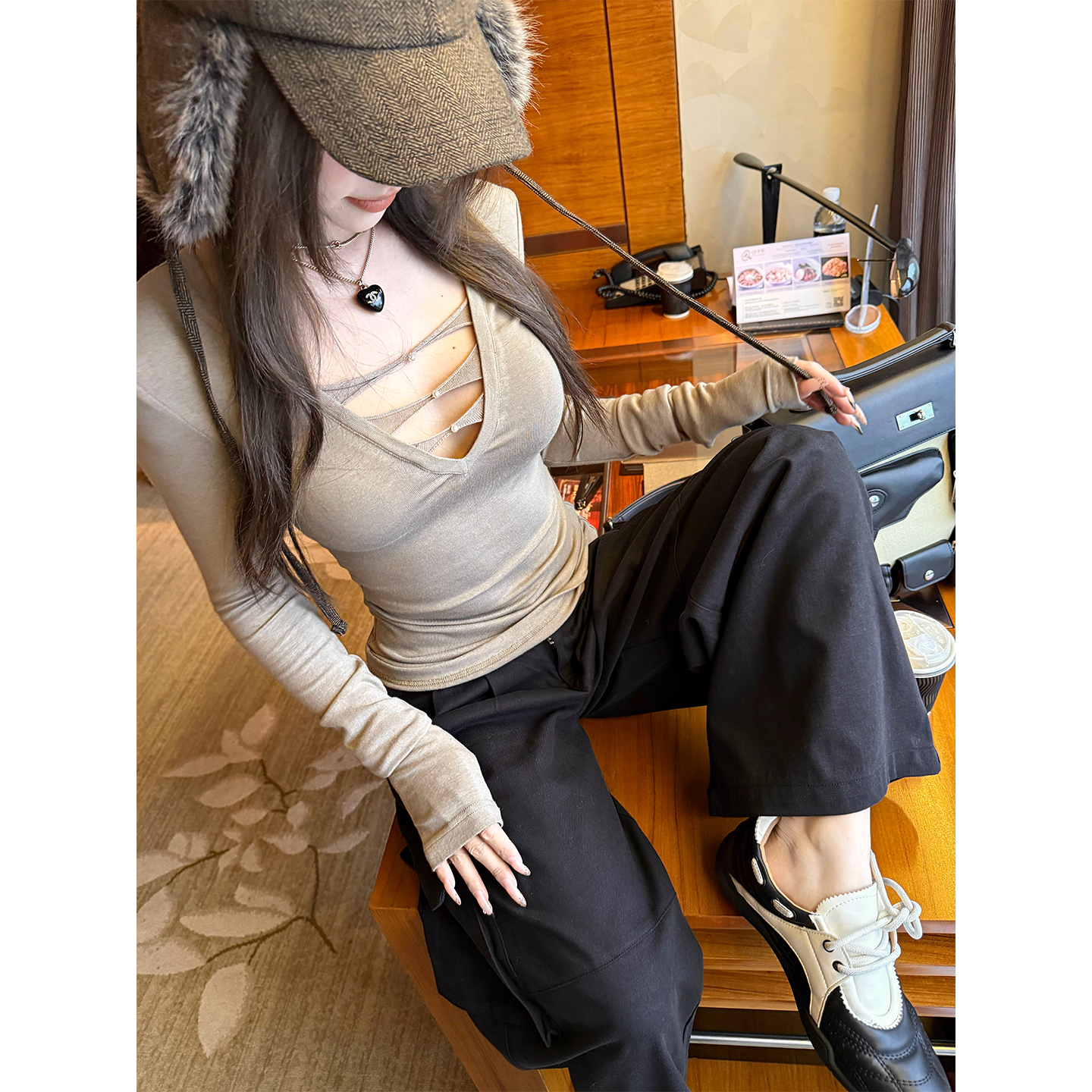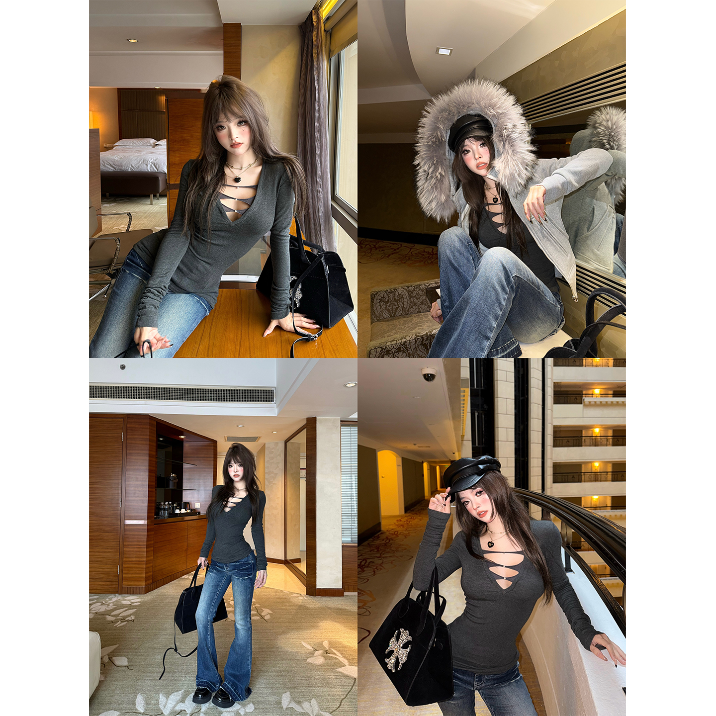 秋澄LeeAutumn 深V领性感镂空显瘦长袖打底衫针织衫低胸纯欲上衣