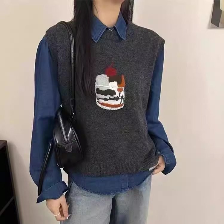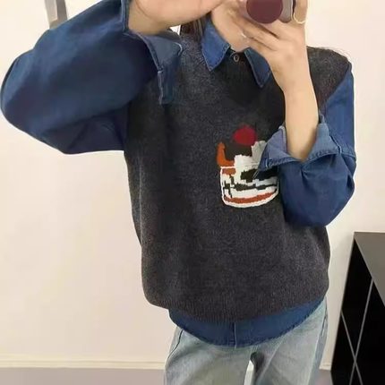韩版小象提花针织背心polo领衬衫套装2025冬季新款女减龄两件套潮