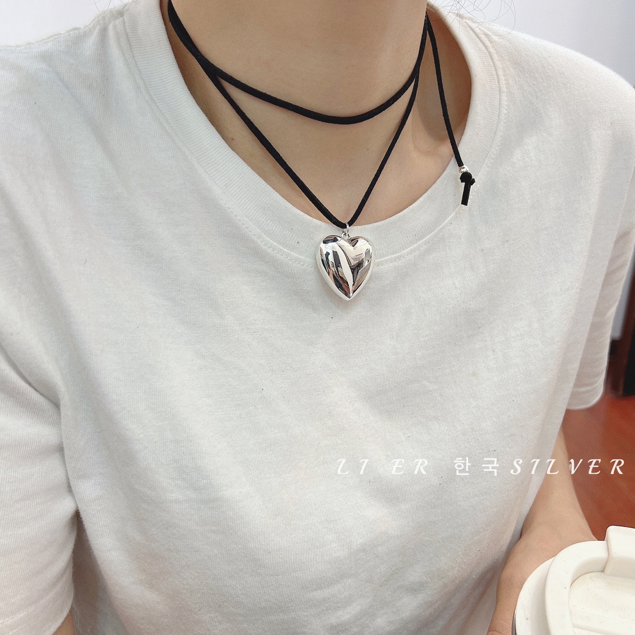 韩单重工s925纯银大爱心项链女ins时尚甜酷黑绳系带锁骨链毛衣链