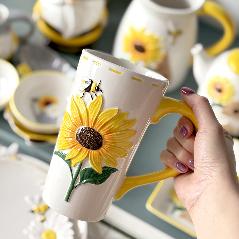 向日葵花园蜜蜂陶瓷马克杯高颜值北欧咖啡杯大容量办公室水杯ins