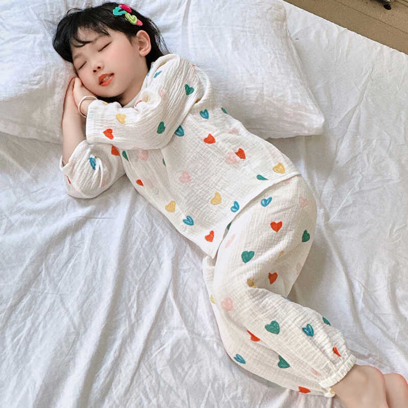 儿童夏季薄款睡衣套装纯棉棉纱长袖印花草莓家居女宝宝洋气空调服
