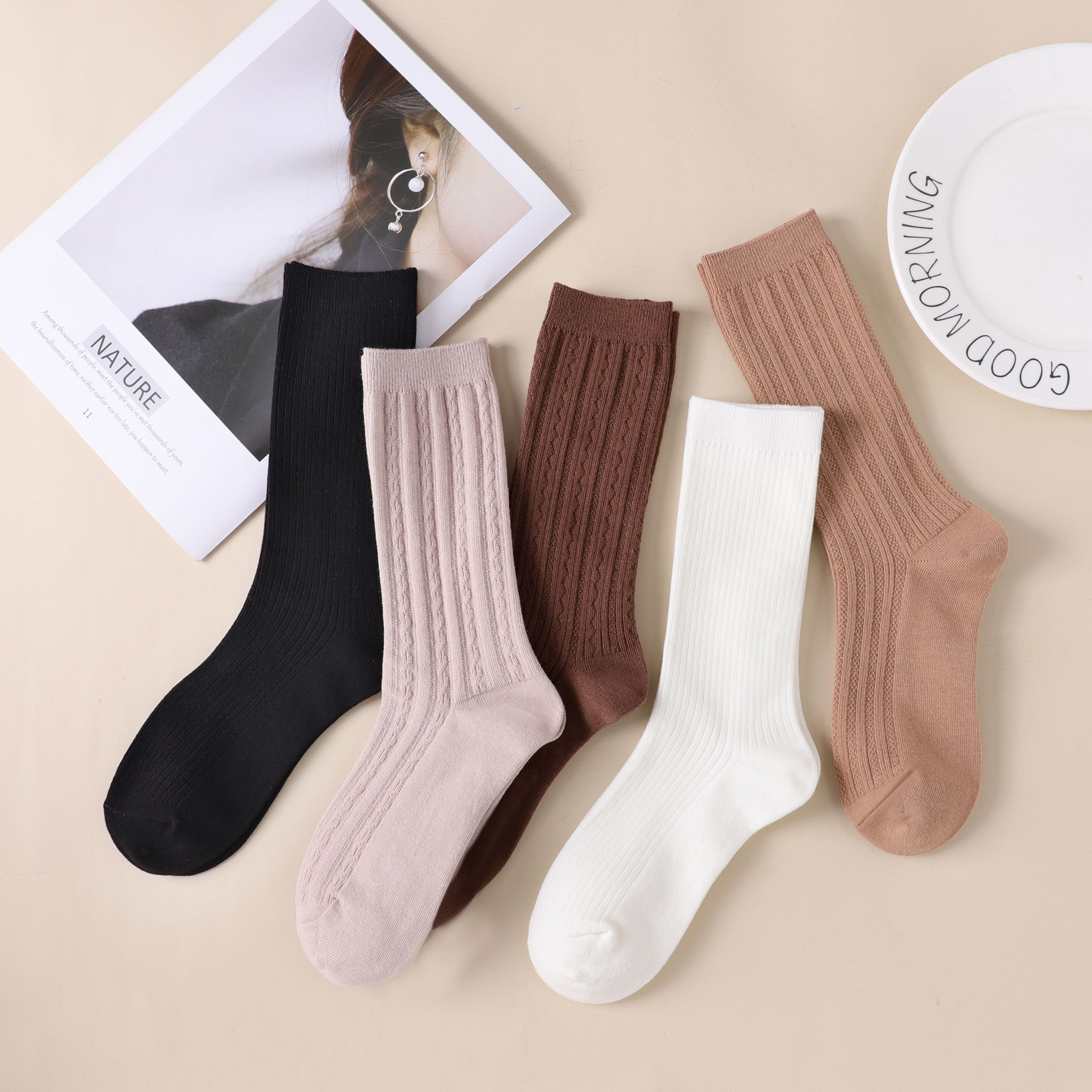 女袜堆堆袜子女士净色棉袜秋冬双针纯色百搭复古色ins系高筒袜JX