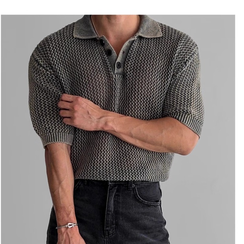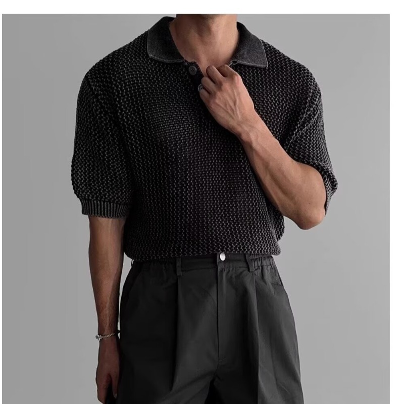 镂空翻领针织T恤男士夏季宽松设计感Polo衫韩版潮流小众短袖透气