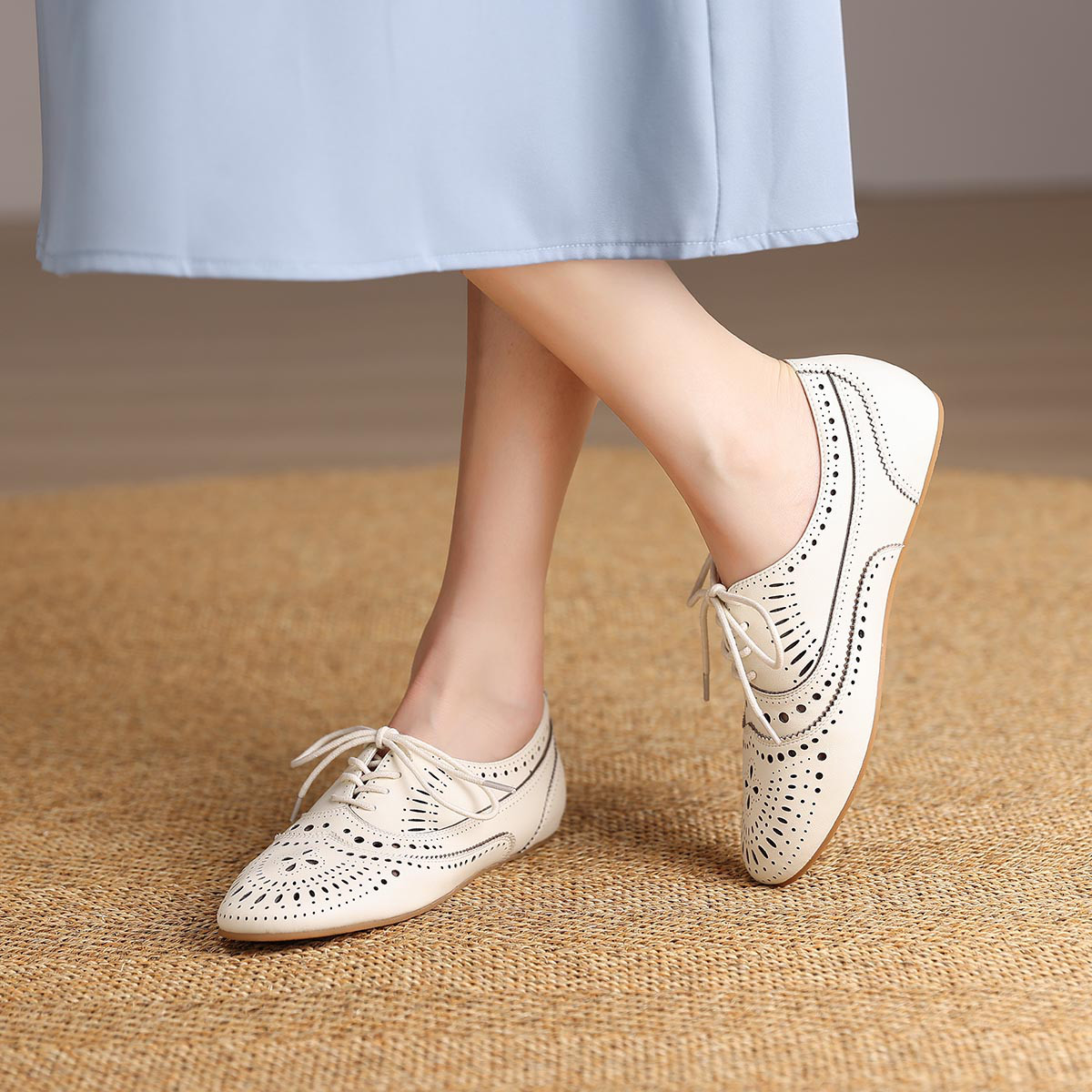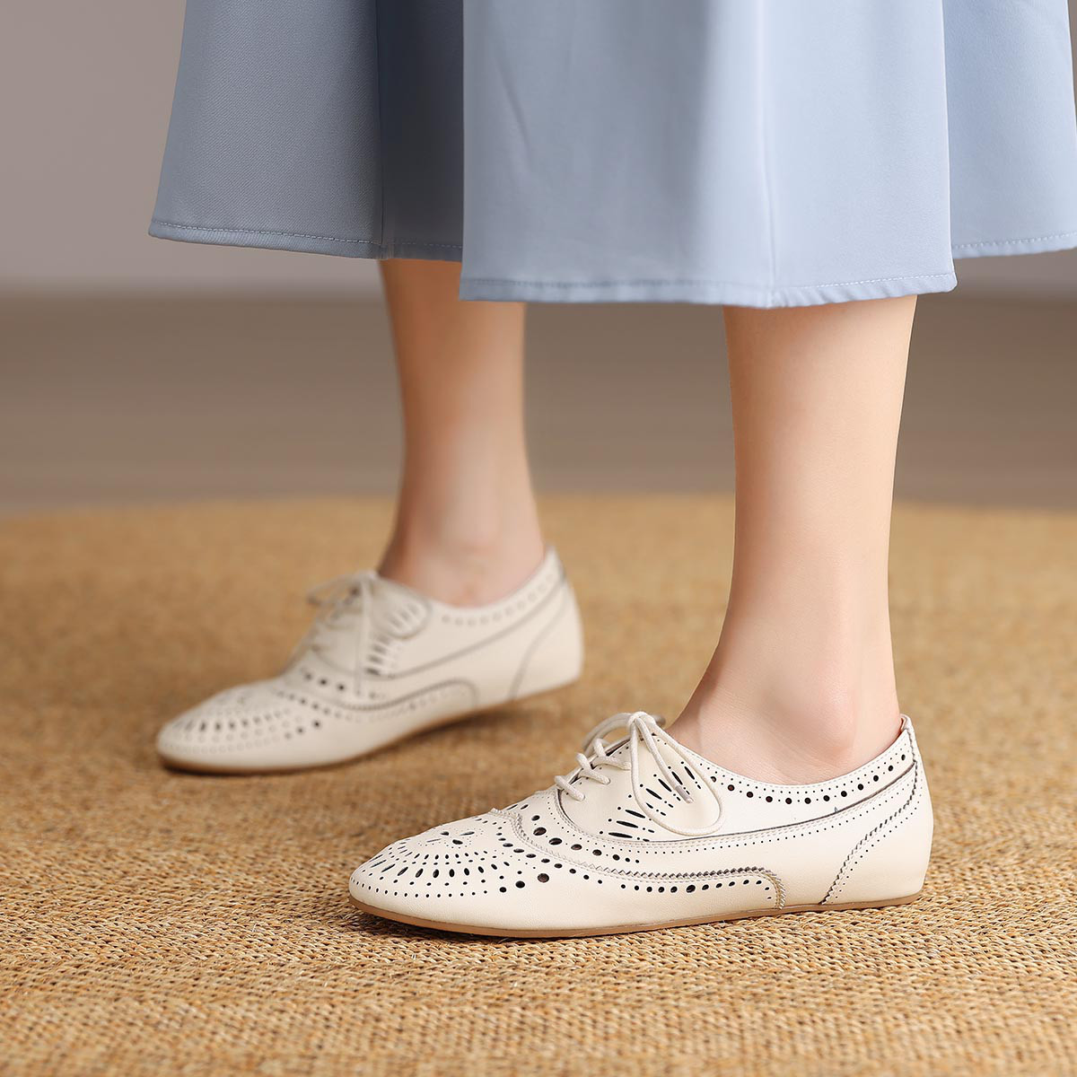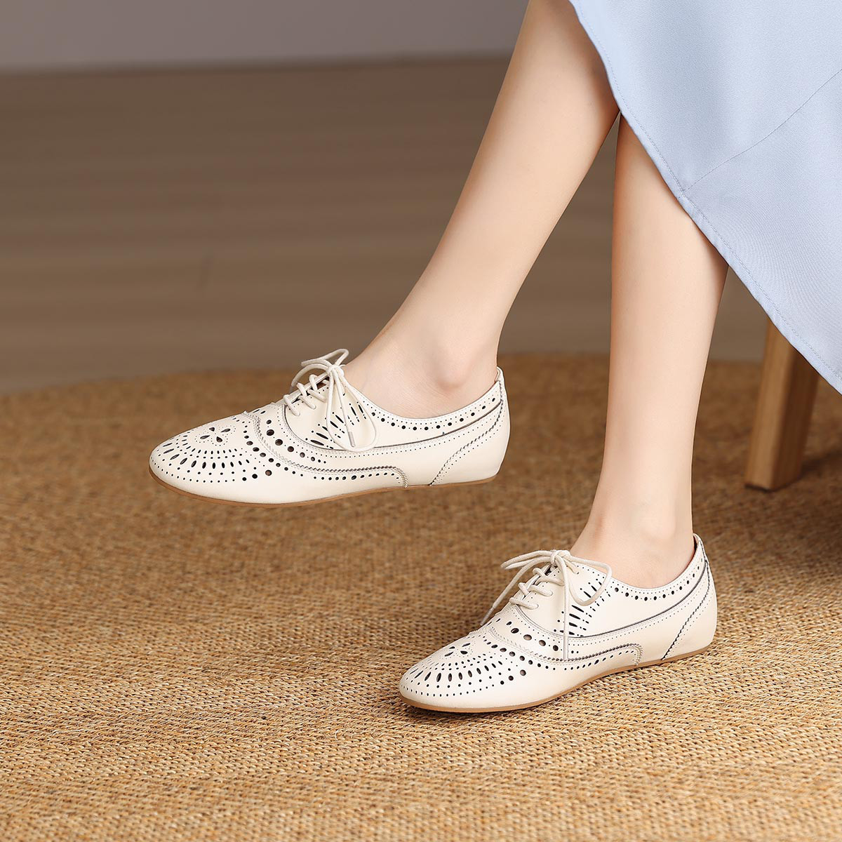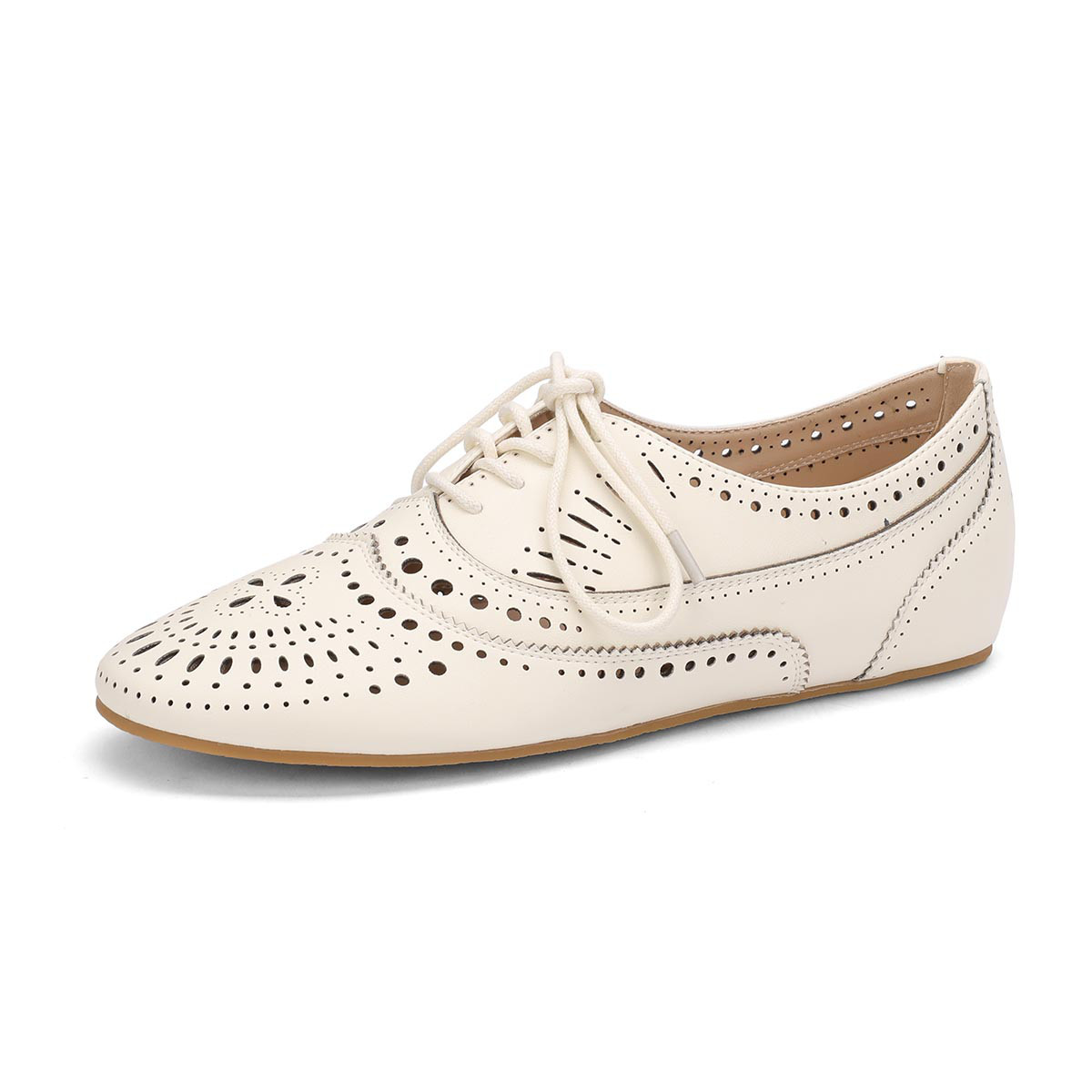 单鞋女浅口全真皮女鞋平底休闲鞋雕花系带低跟镂空夏季新款小皮鞋