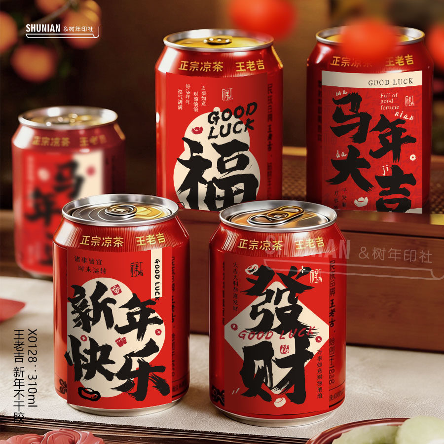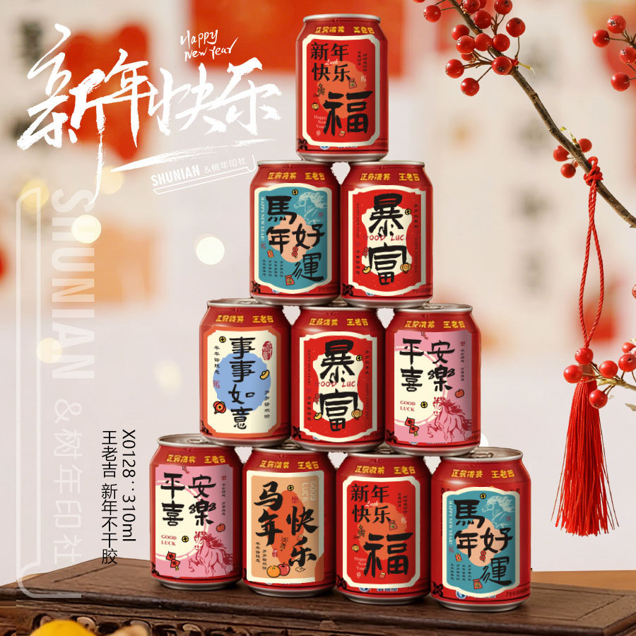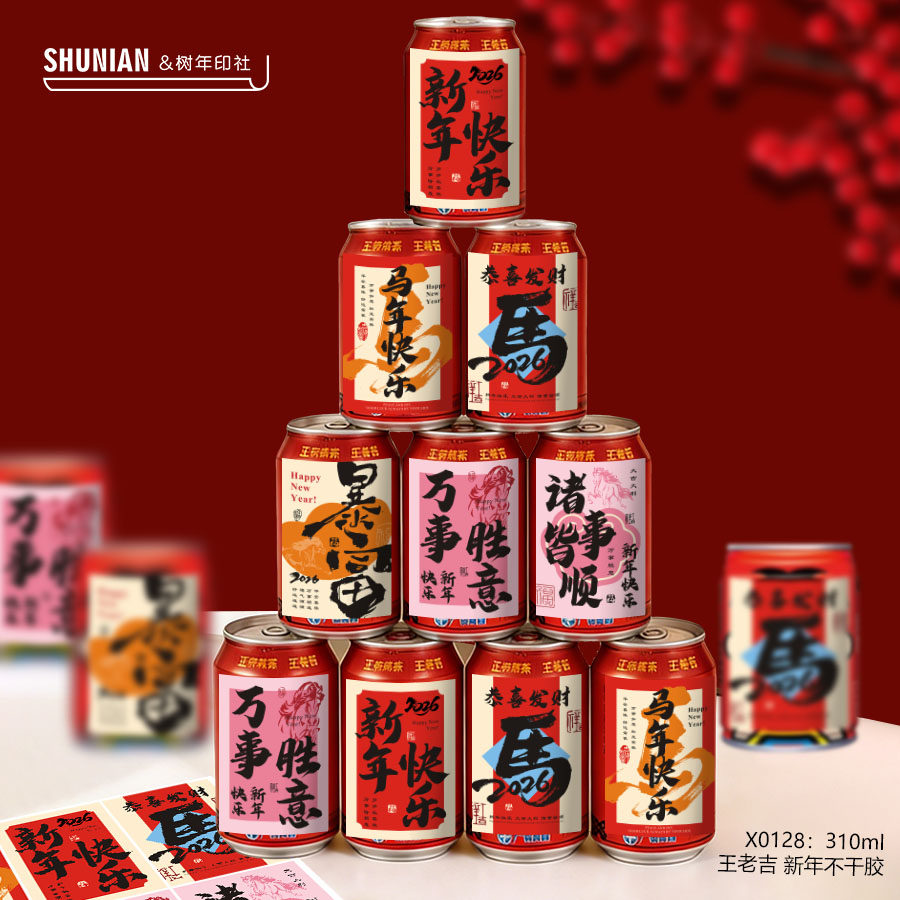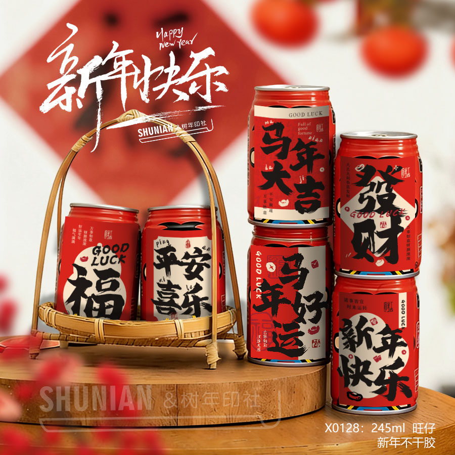 可乐贴纸不干胶易拉罐新年快乐标签旺仔饮料小卡片跨年牛奶瓶贴