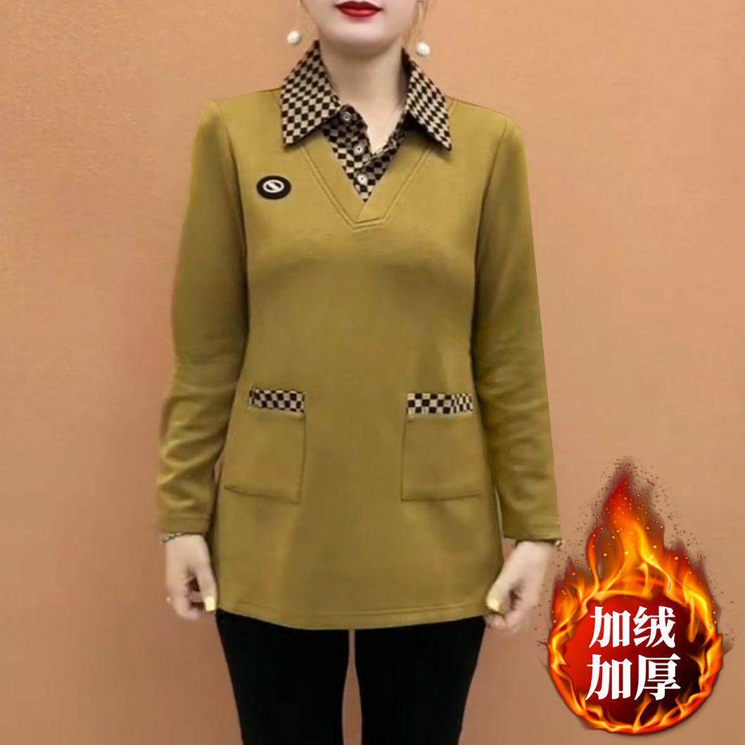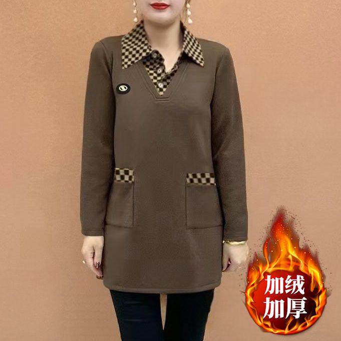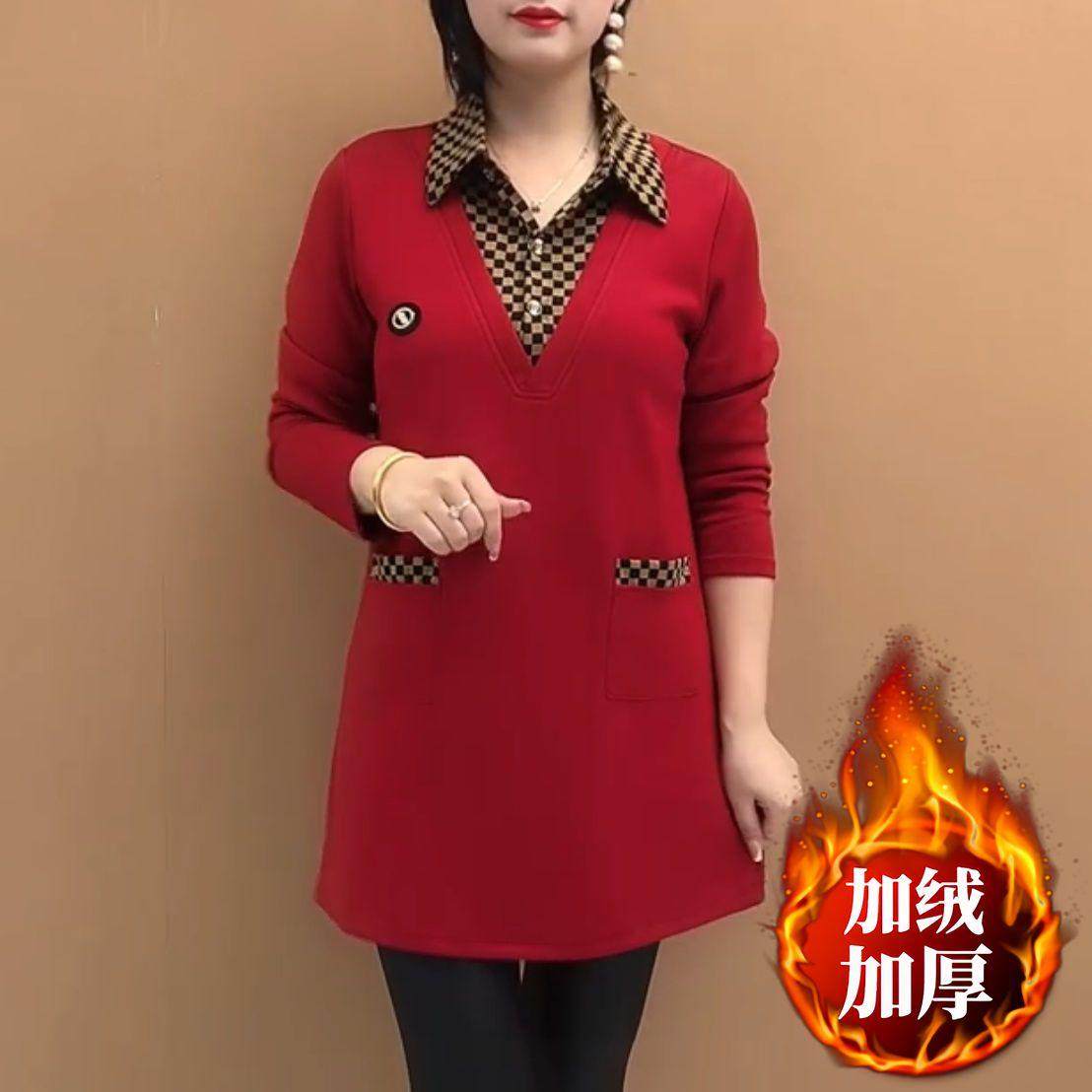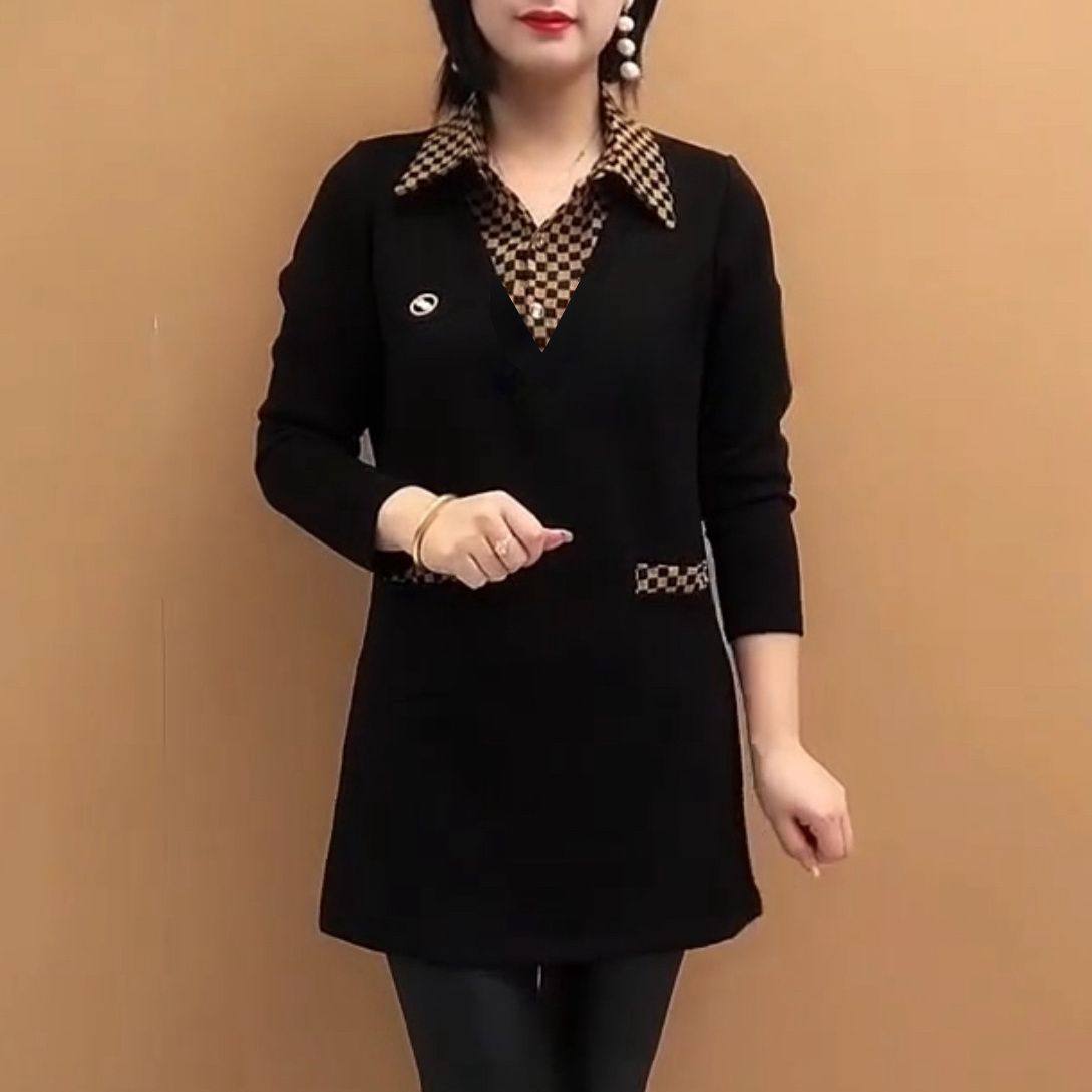 中年妈妈装中长款打底上衣2025秋冬新款假两件时尚休闲长袖连衣裙