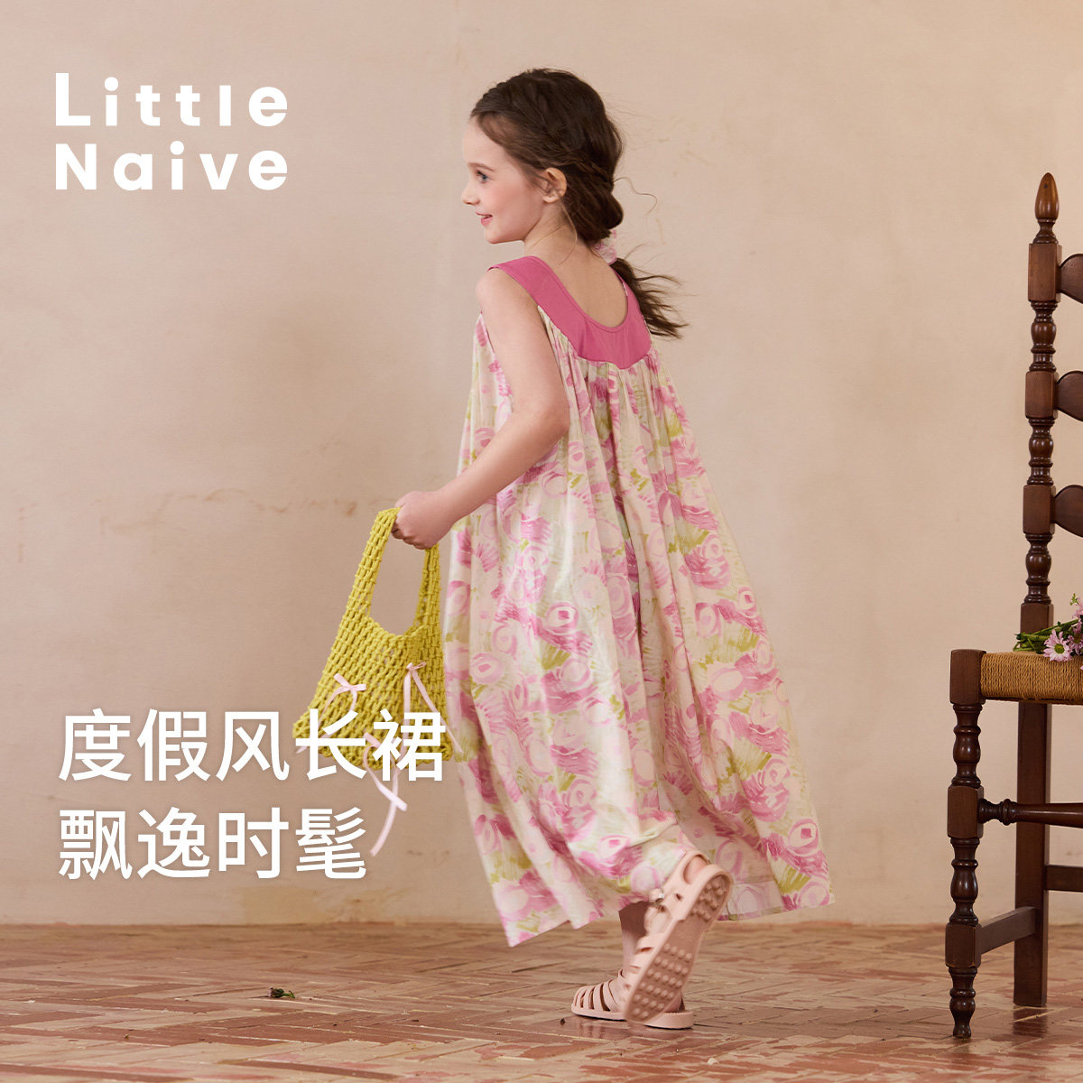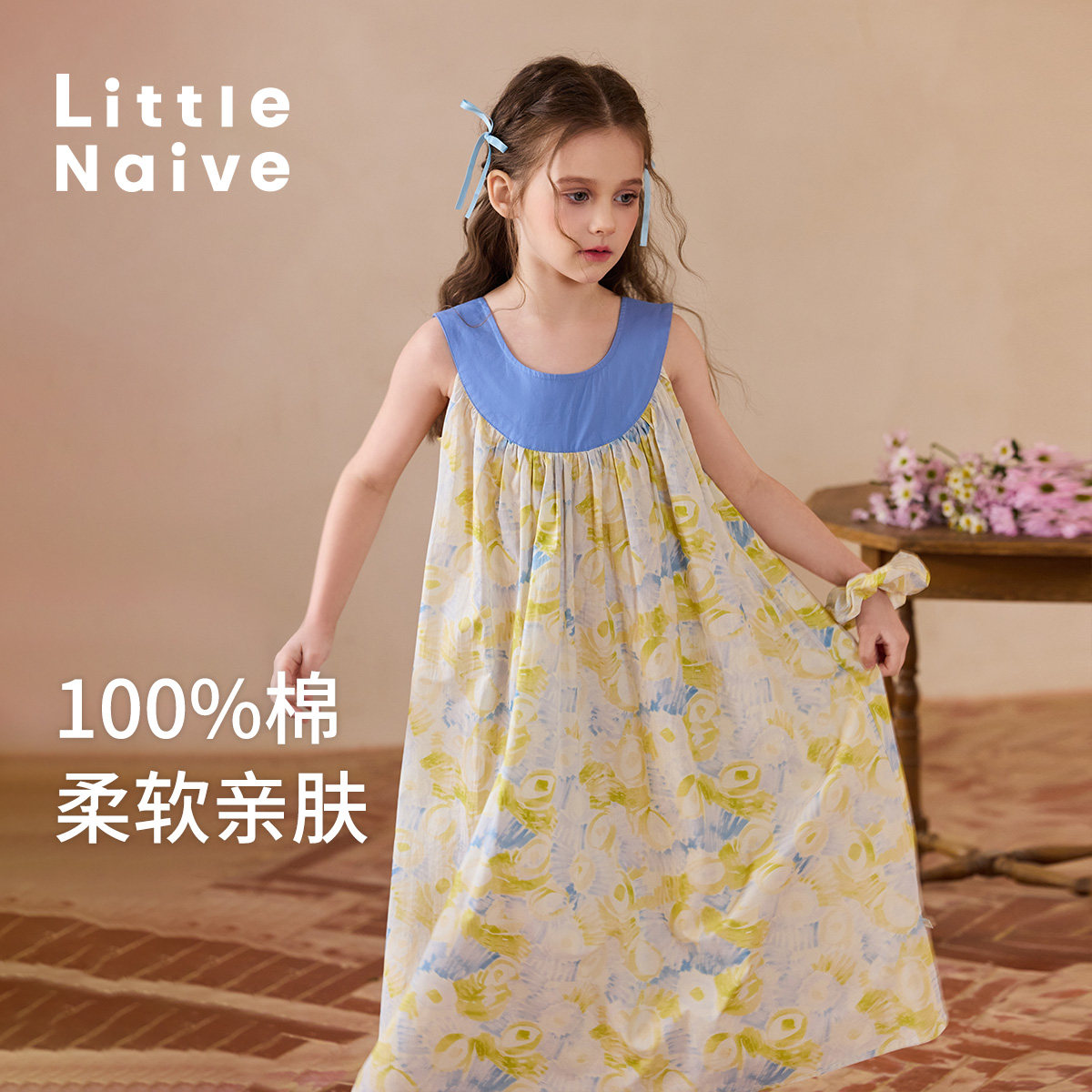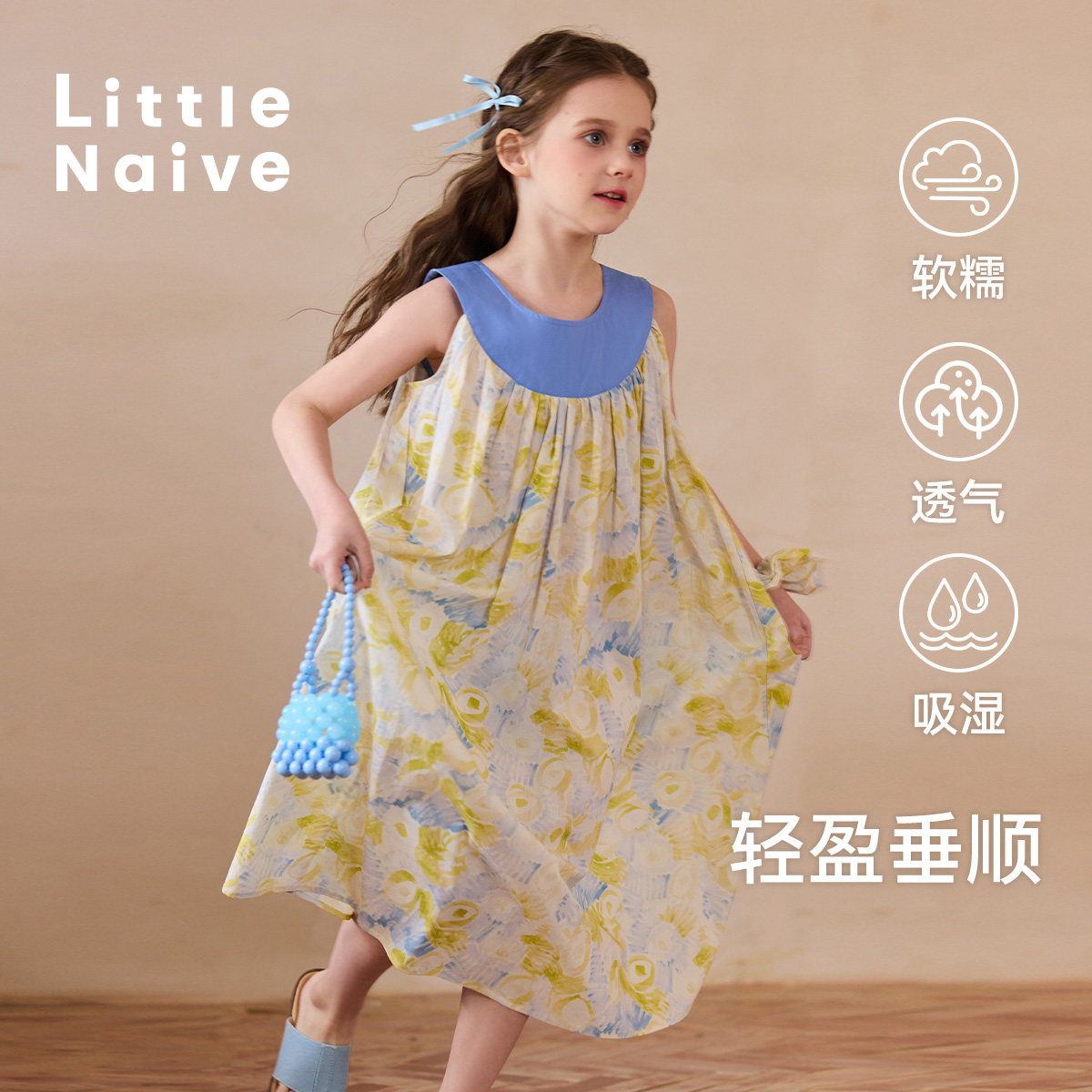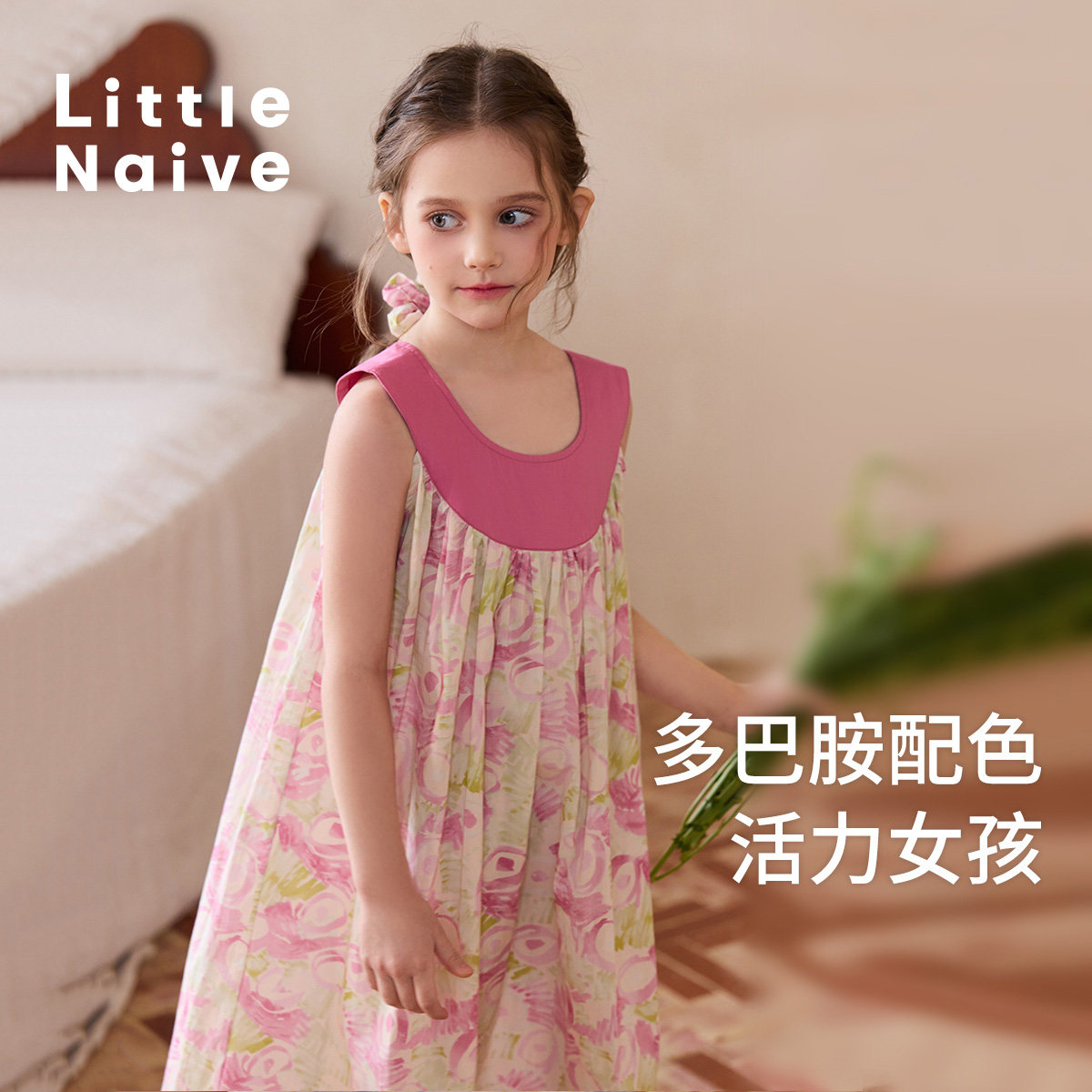 Little Naive女童纯棉连衣裙夏季新款插肩碎花裙儿童度假风背心裙