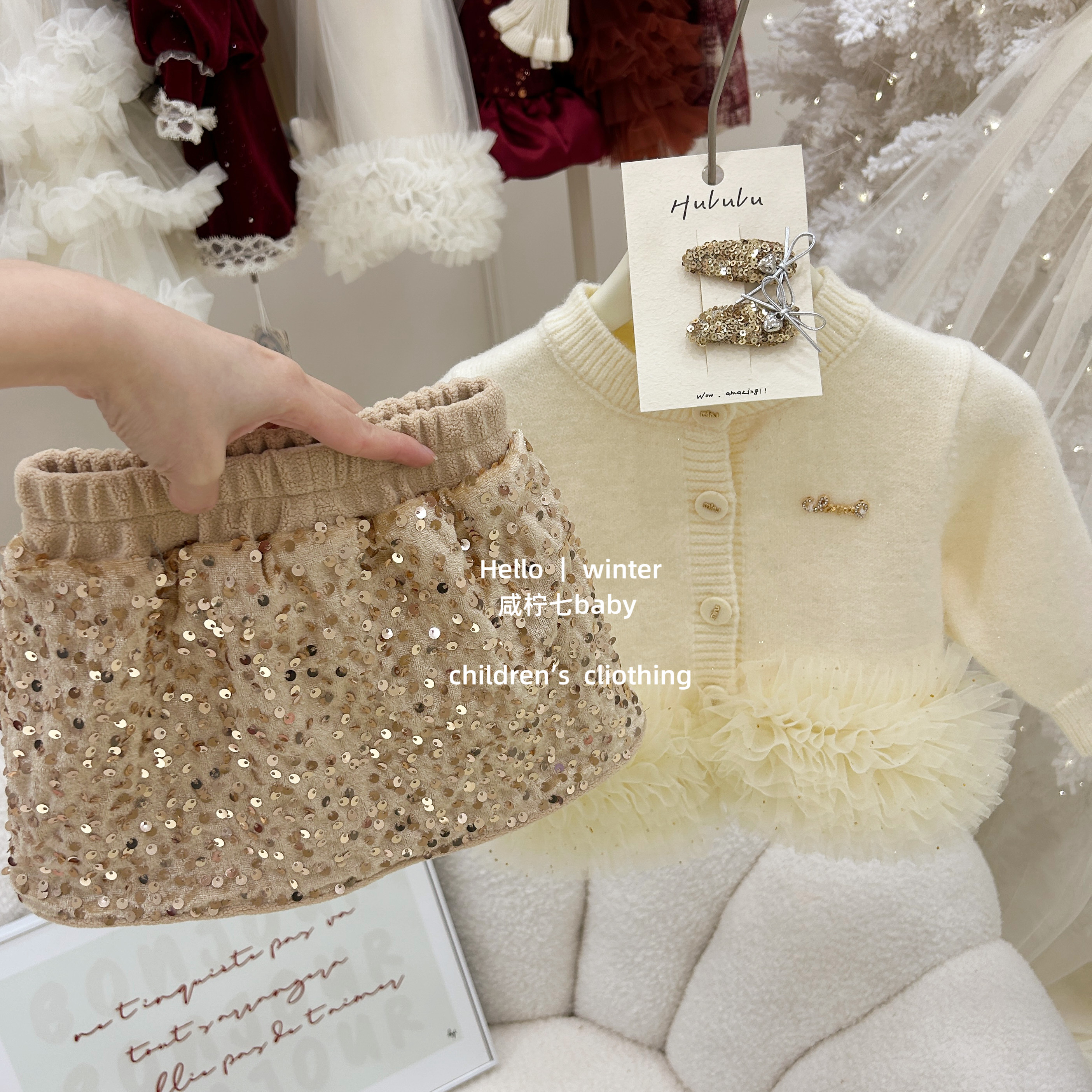 【咸柠七】鎏金!女童秋冬套装网纱毛衣开衫外套亮片半身裙两件套