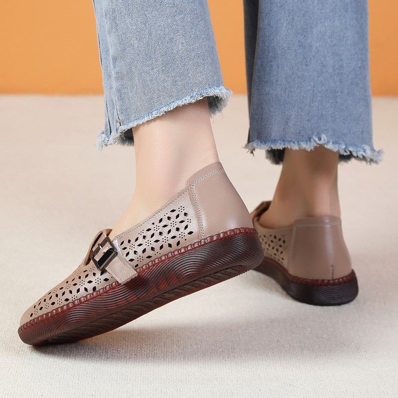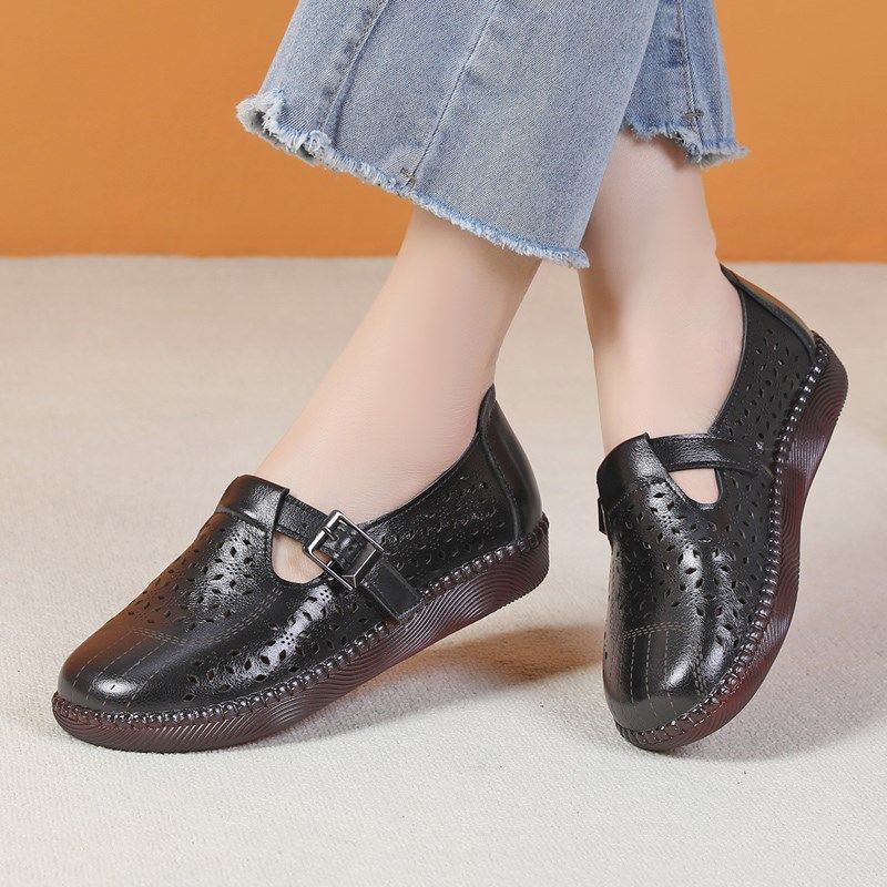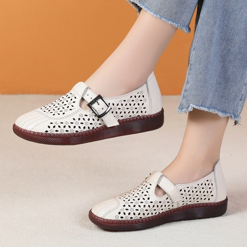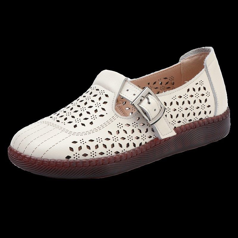 牛筋底妈妈凉鞋真皮平底休闲洞洞女鞋透气镂空复古中老年皮鞋夏季