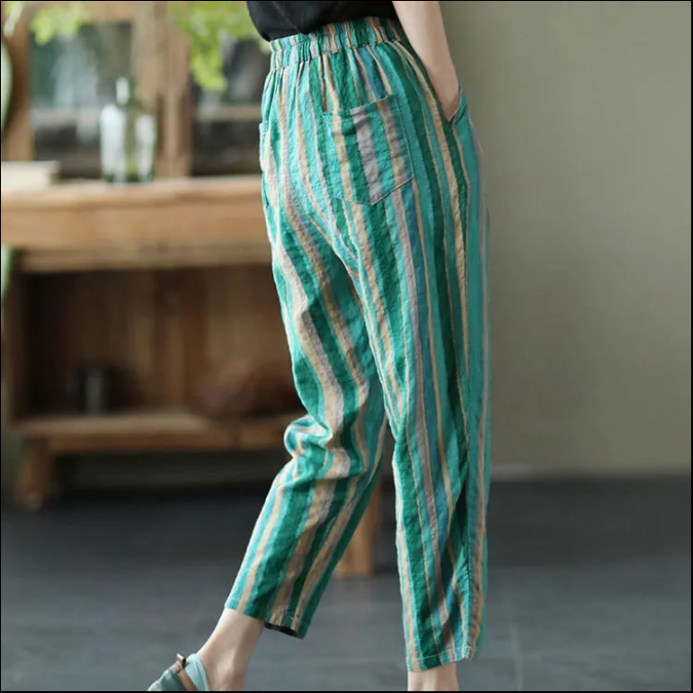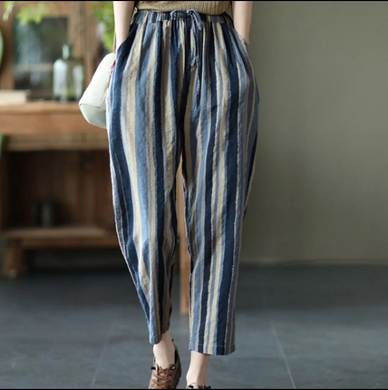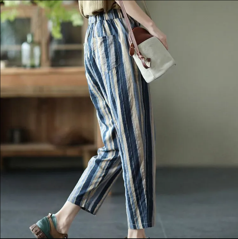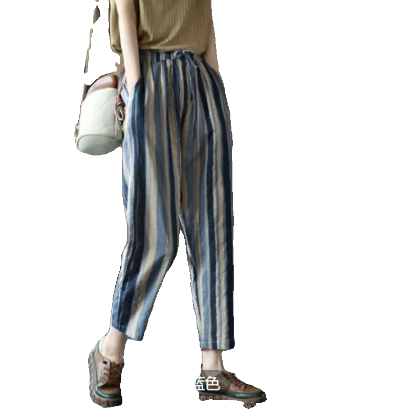 薄款棉麻九分裤女宽松大码百搭条纹休闲裤松紧腰哈伦裤亚麻女裤子