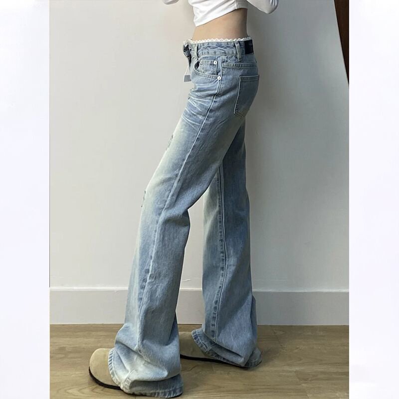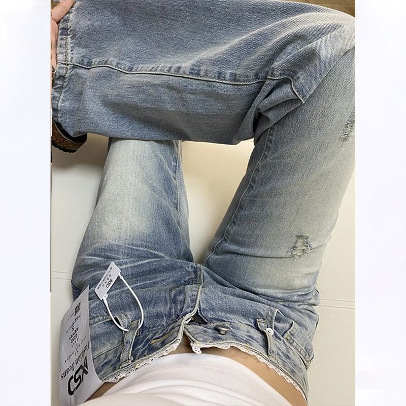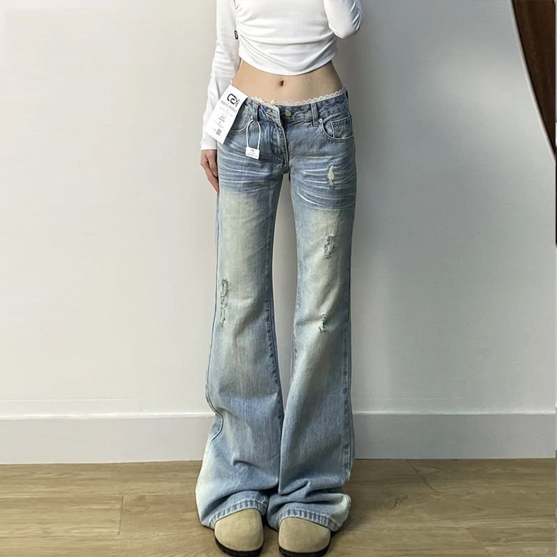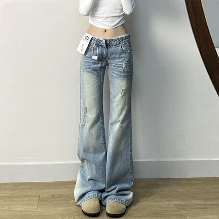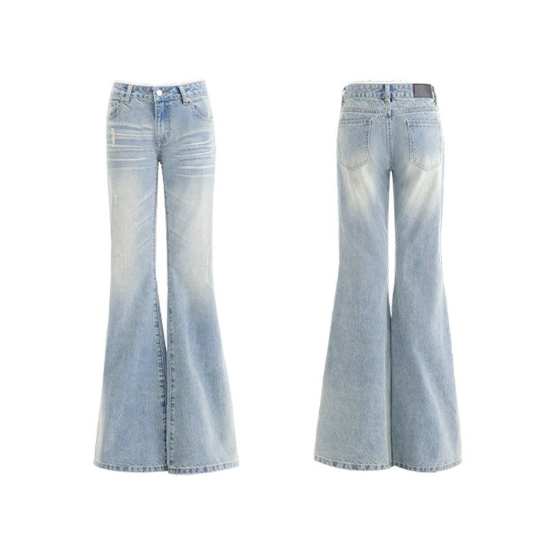 辣妹复古破洞浅蓝色牛仔裤女夏季不贴腿显瘦喇叭裤垂感高腰长裤潮