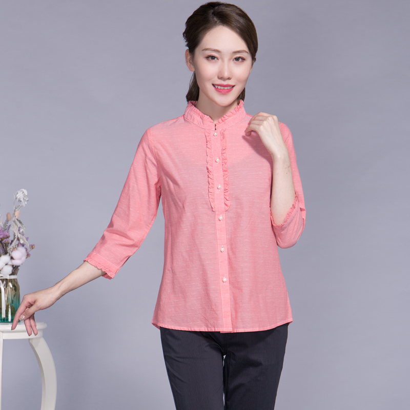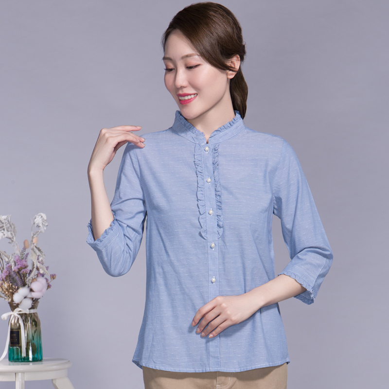 富木夏季女士立领七分袖棉衬衫