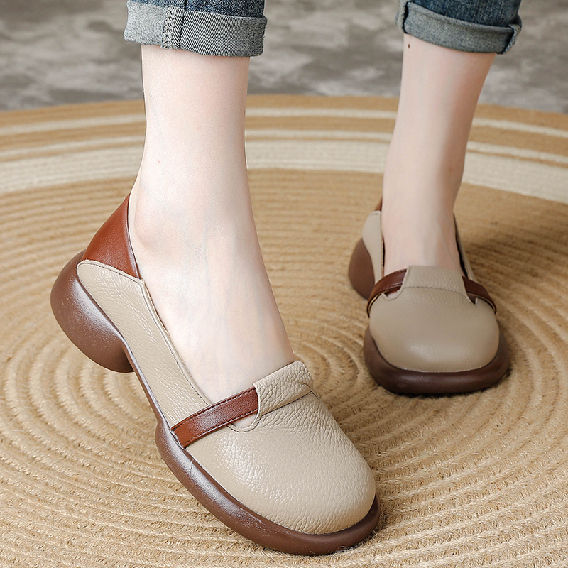 春秋头层牛皮新款真皮单鞋圆头软面软底小皮鞋复古拼色中年妈妈鞋