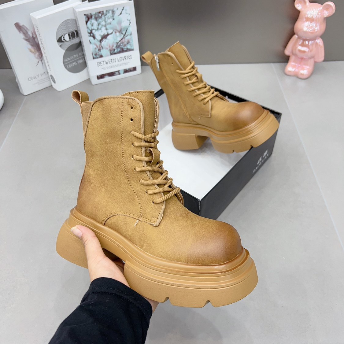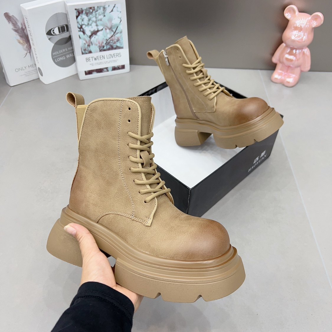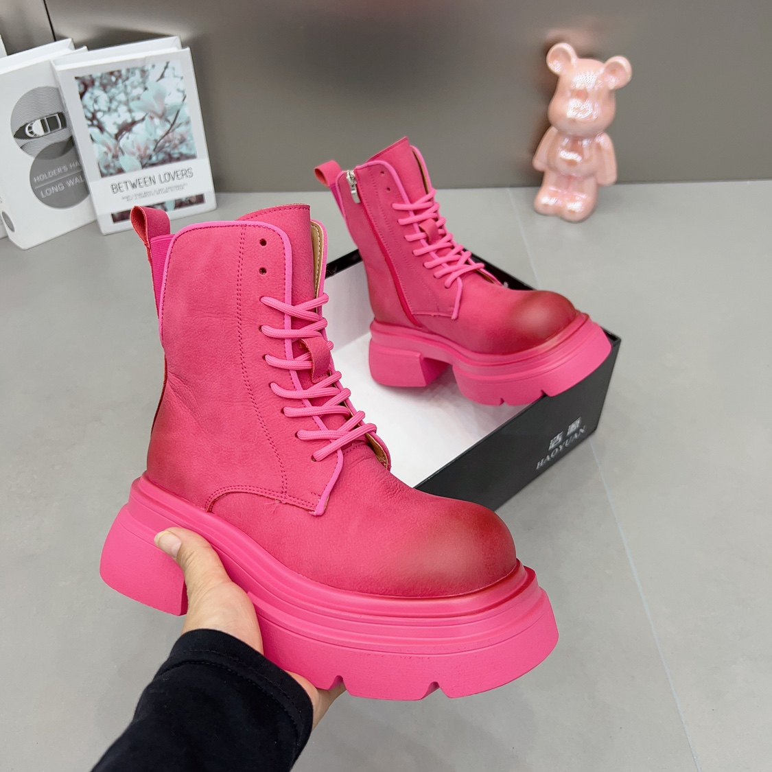 欧货潮鞋系带英伦风厚底马丁靴圆头平底韩版枚粉色短靴户外工装靴