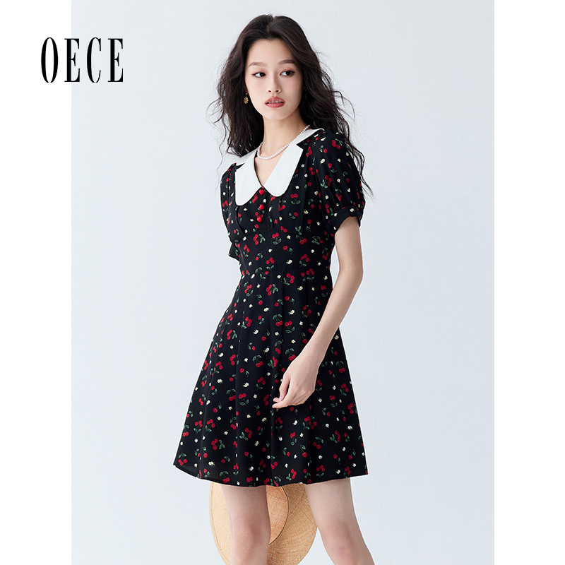 Oece法式娃娃领碎花裙夏季新款女复古小个子收腰显瘦连衣裙短