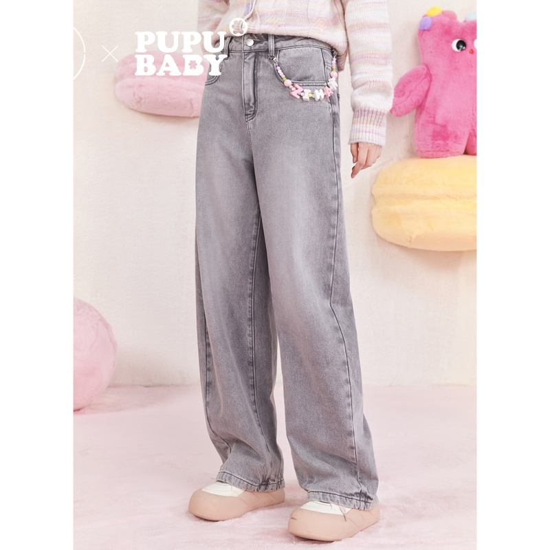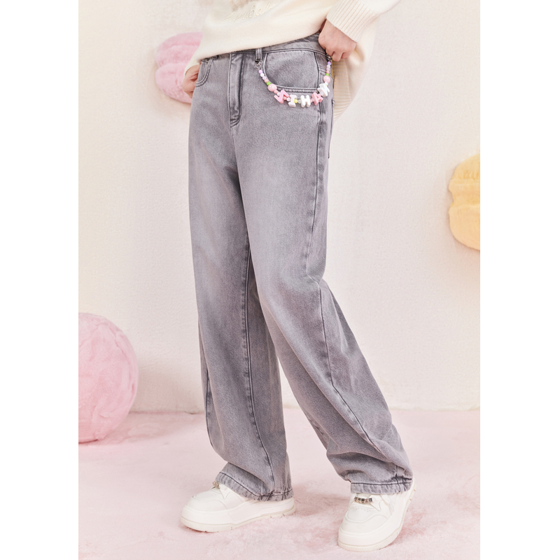 紫涵100%纯棉阔腿牛仔裤女冬季新款宽松高腰复古水洗灰色休闲裤子