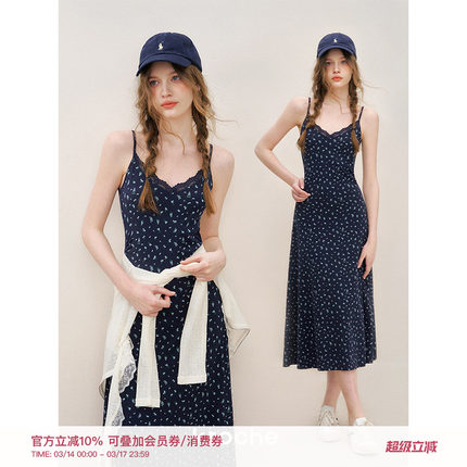 蕾丝花边碎花A字吊带连衣裙