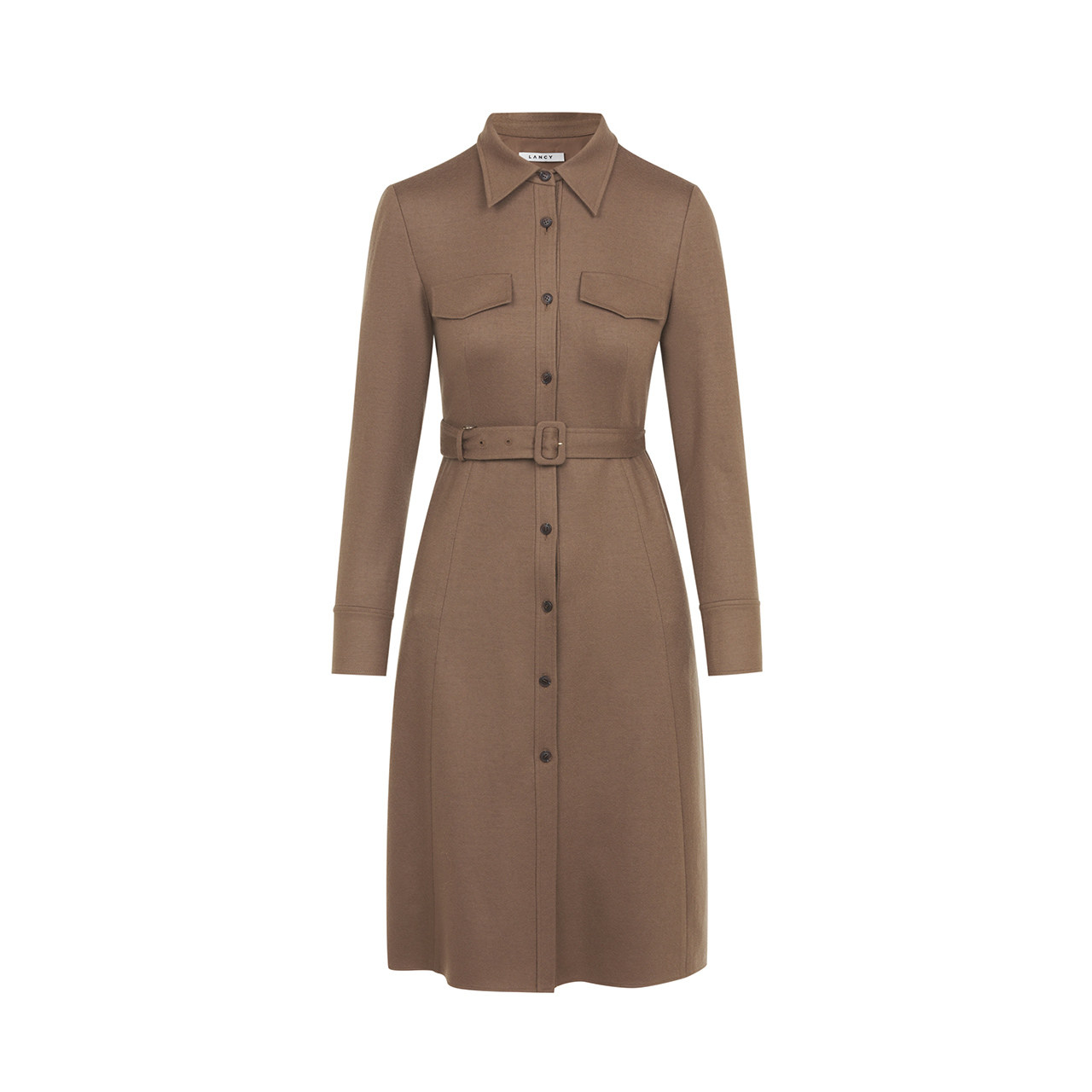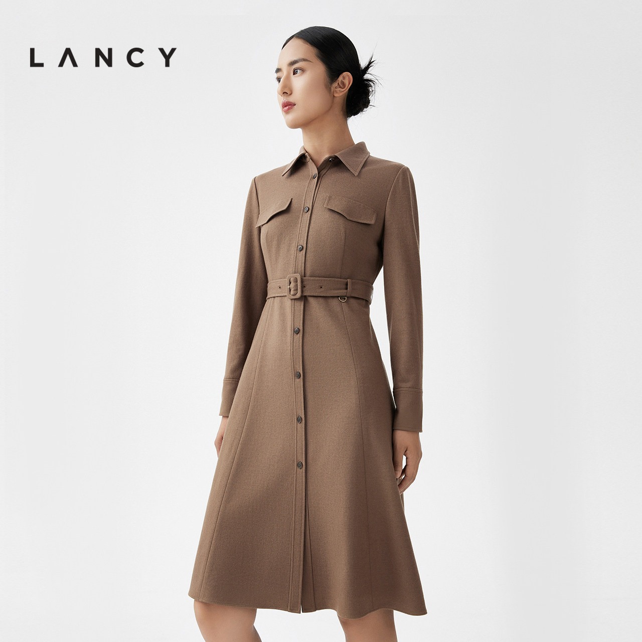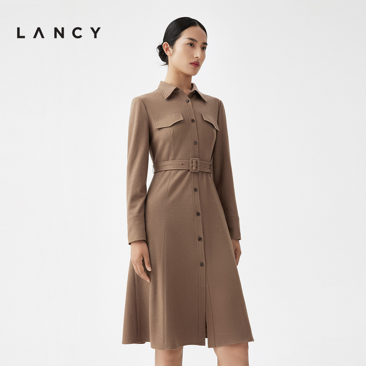 LANCY/朗姿2023秋冬新款长袖中长款收腰羊毛衬衫连衣裙女法式气质