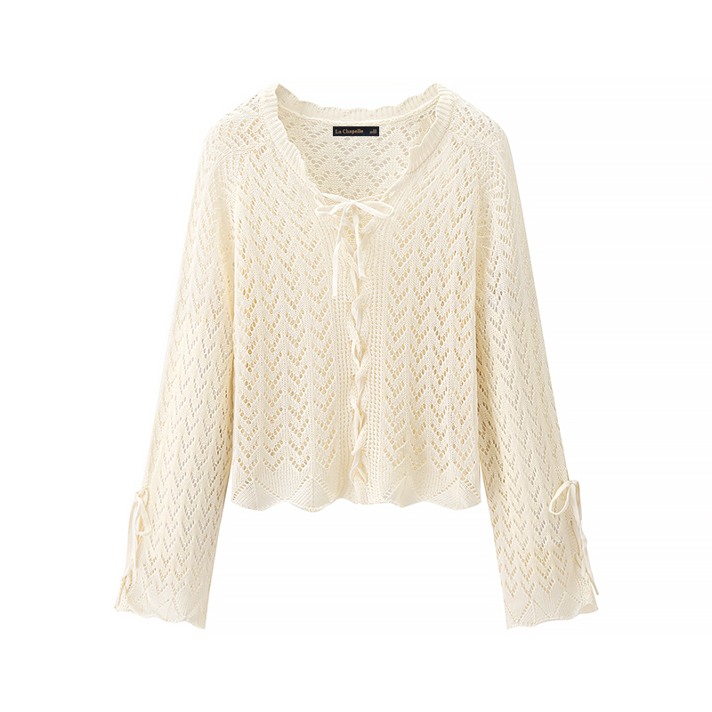 拉夏贝尔/La Chapelle杏色镂空针织开衫女夏季小香风薄款防晒上衣
