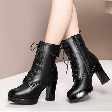 百丽 班尼女靴冬季真皮高跟马丁靴女短靴粗跟单靴加绒中筒靴棉靴