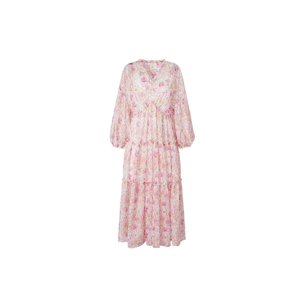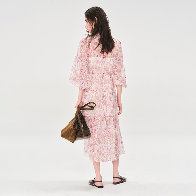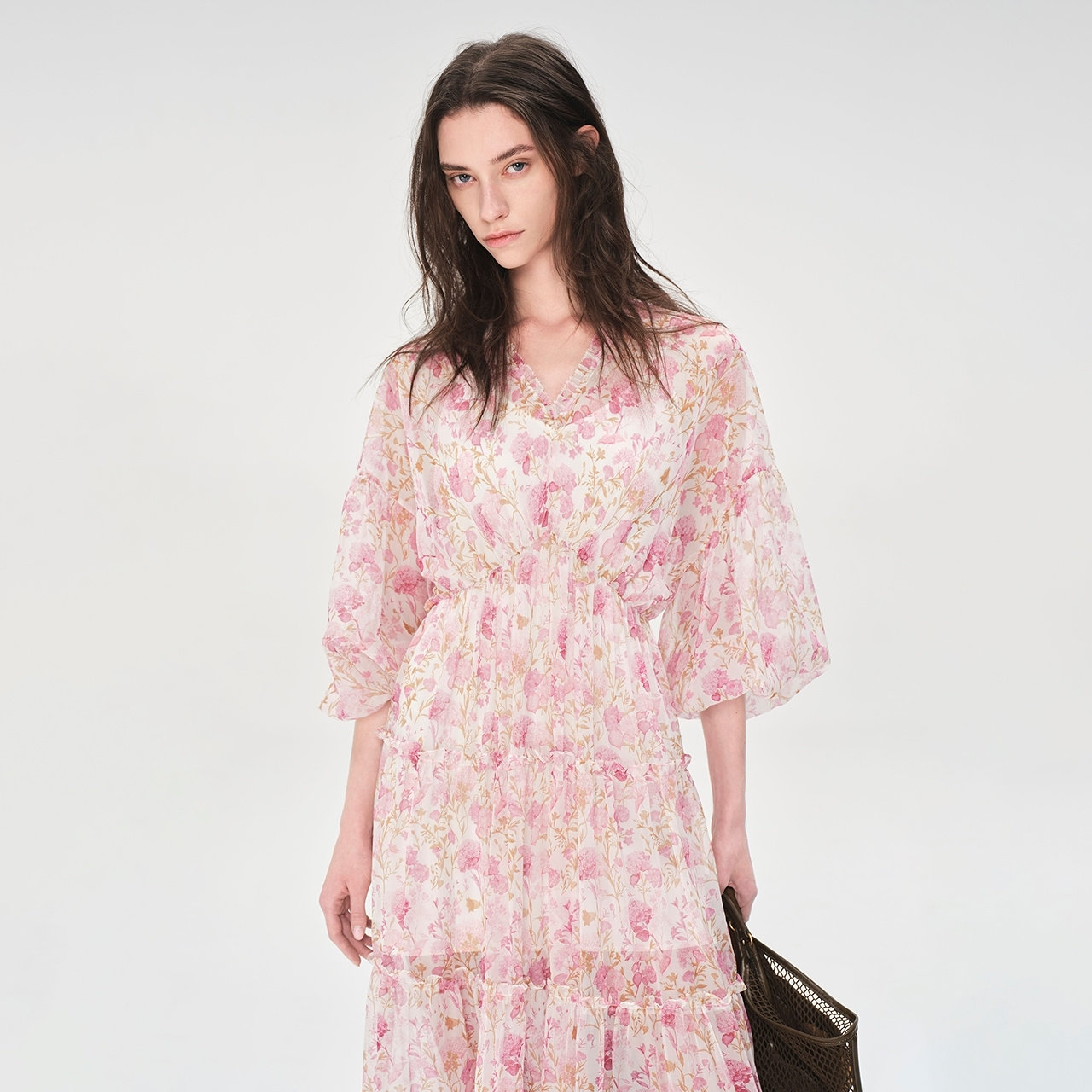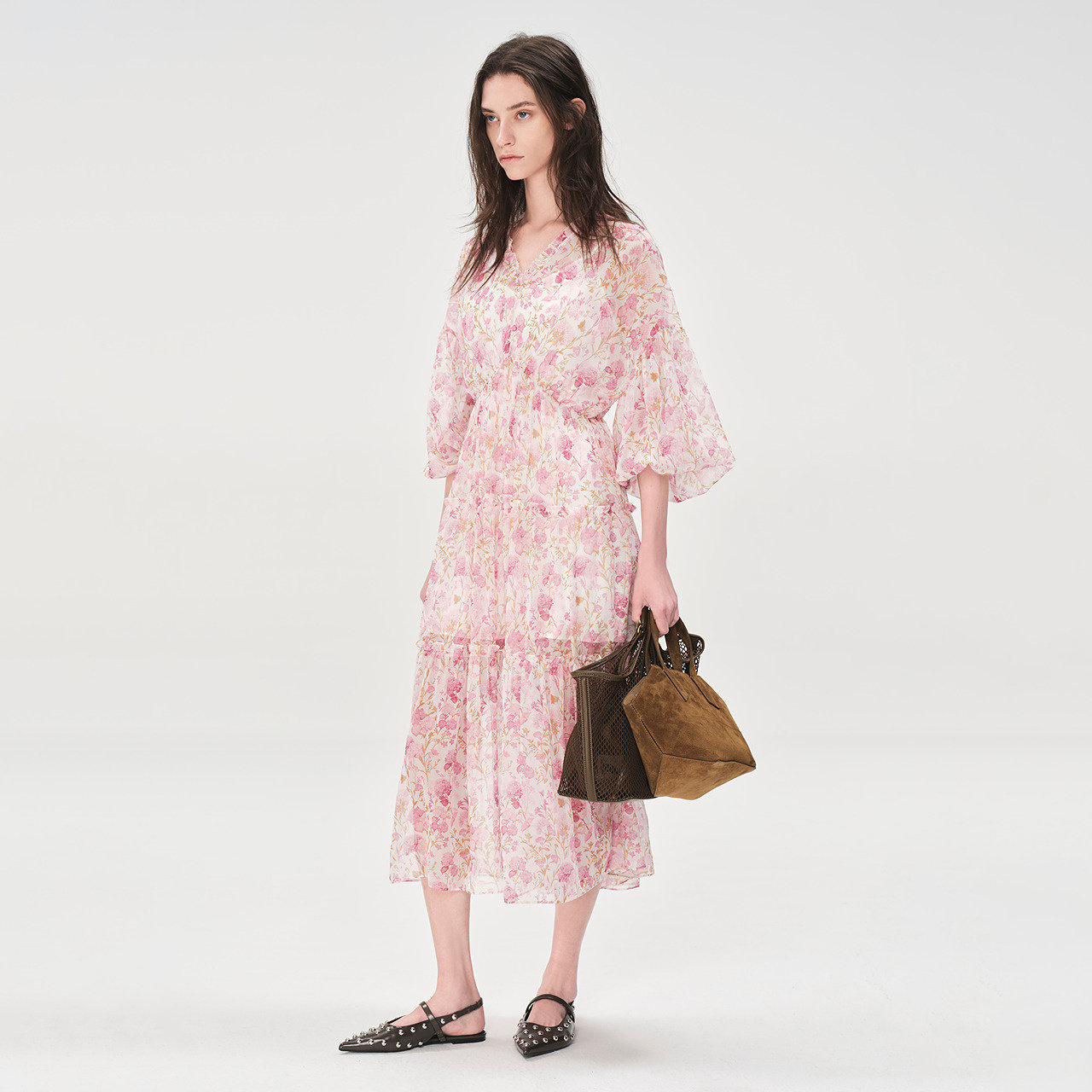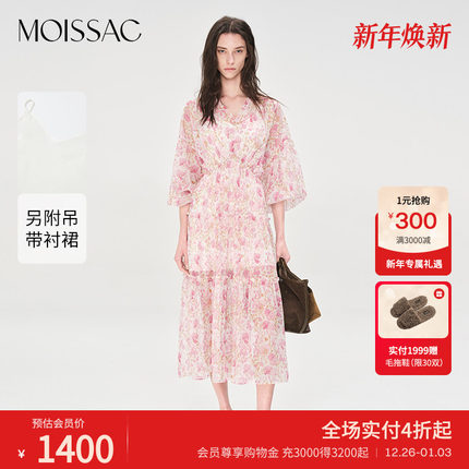 商场同款 摩萨克2025夏新款印花V领收腰木耳边碎花长款连衣裙女