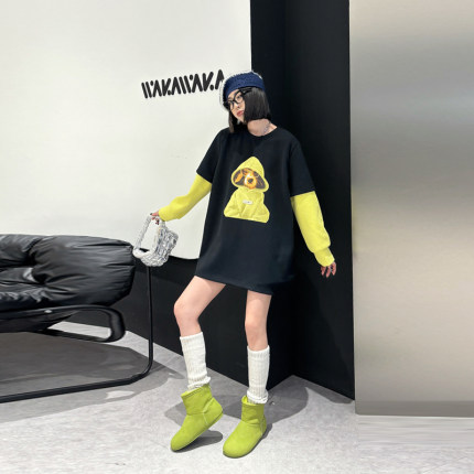 加肥拼接撞色长袖带帽小狗上衣大码女装韩版秋冬假两件百搭T恤衫