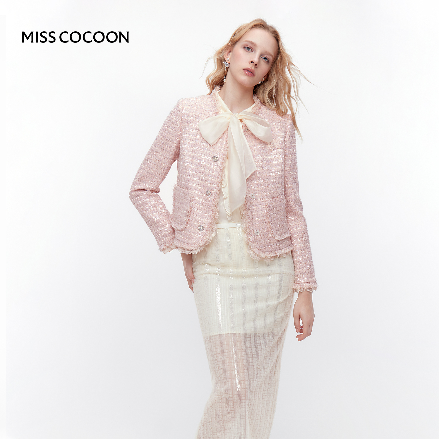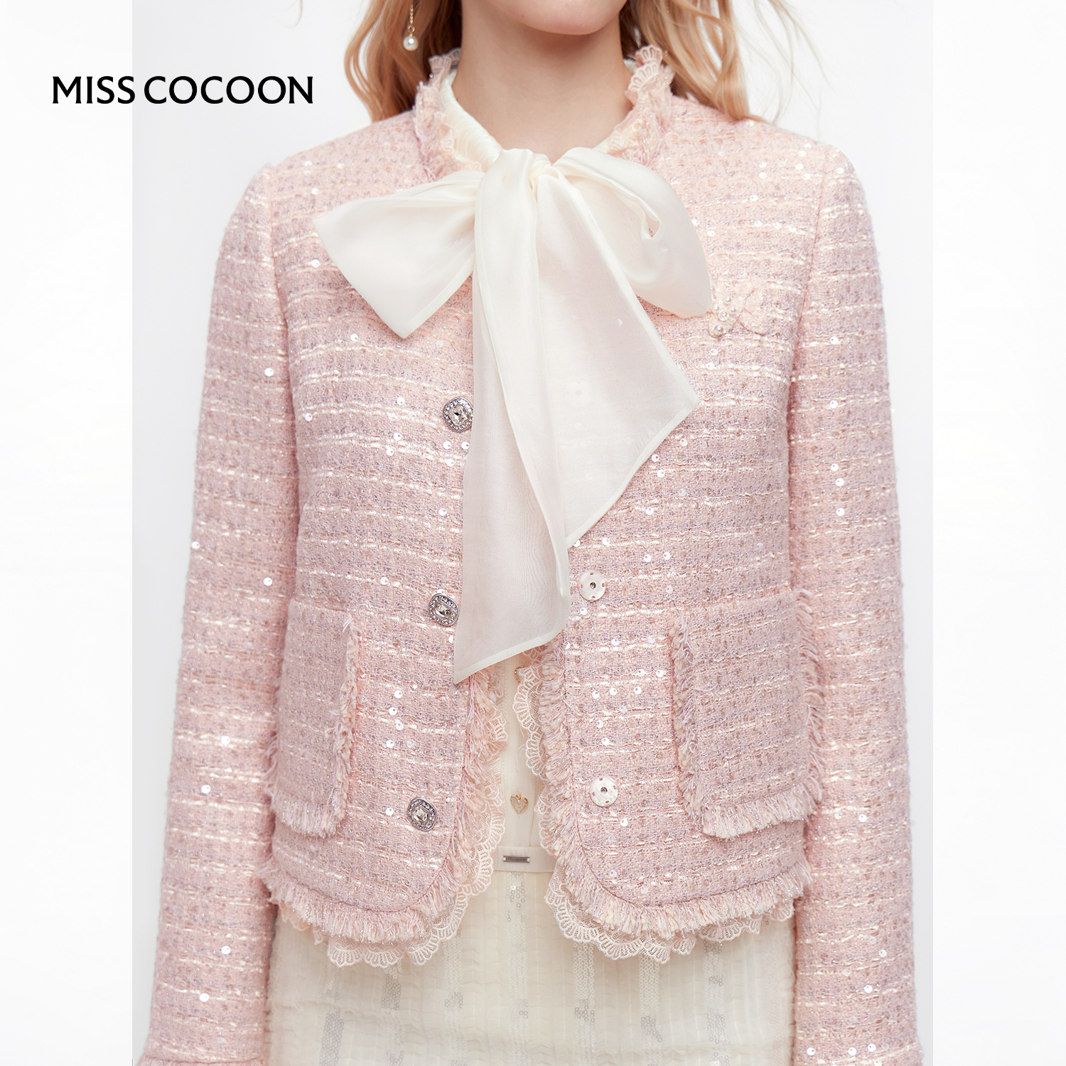 MISSCOCOON可可尼粉色上衣女2025秋冬新款千金小香风修身厚短外套
