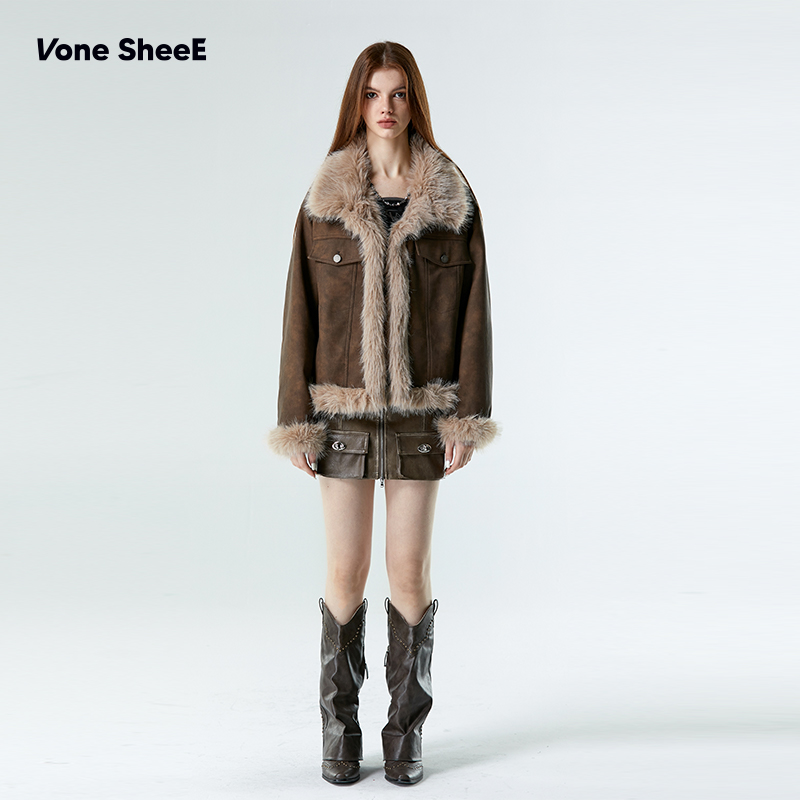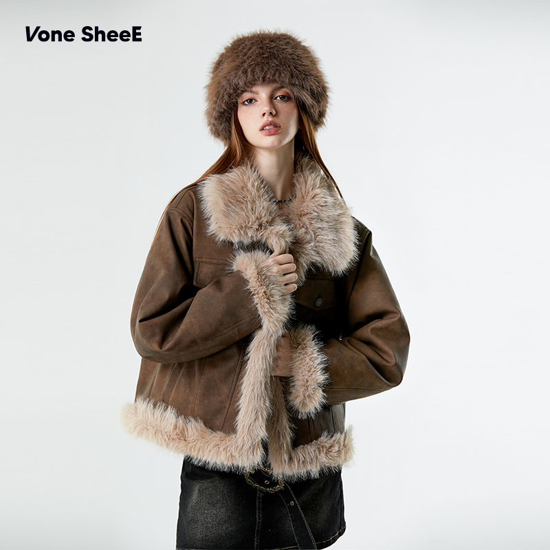 Vone SheeE美式复古毛毛短外套冬2025新款皮草机车服女式皮毛一体