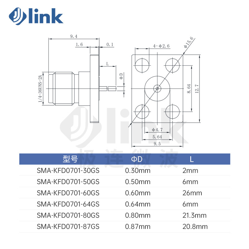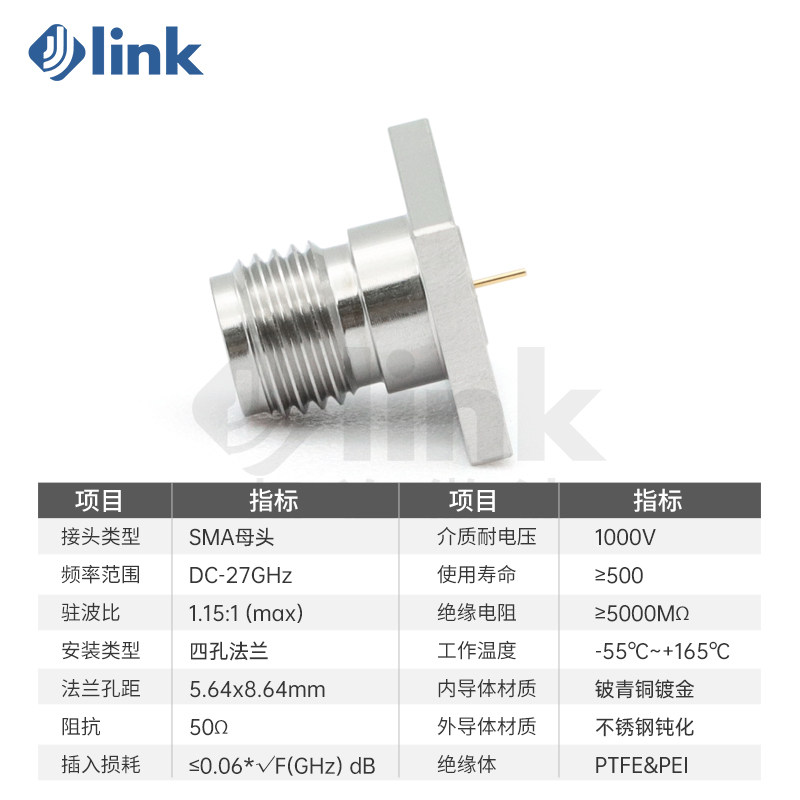 JLINK极连SMA同轴连接器27G穿墙式四孔法兰盘固定接头SMA-KFD0701