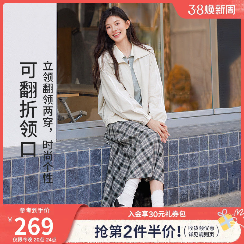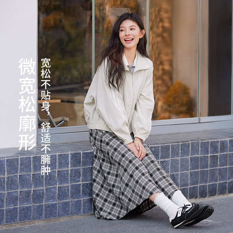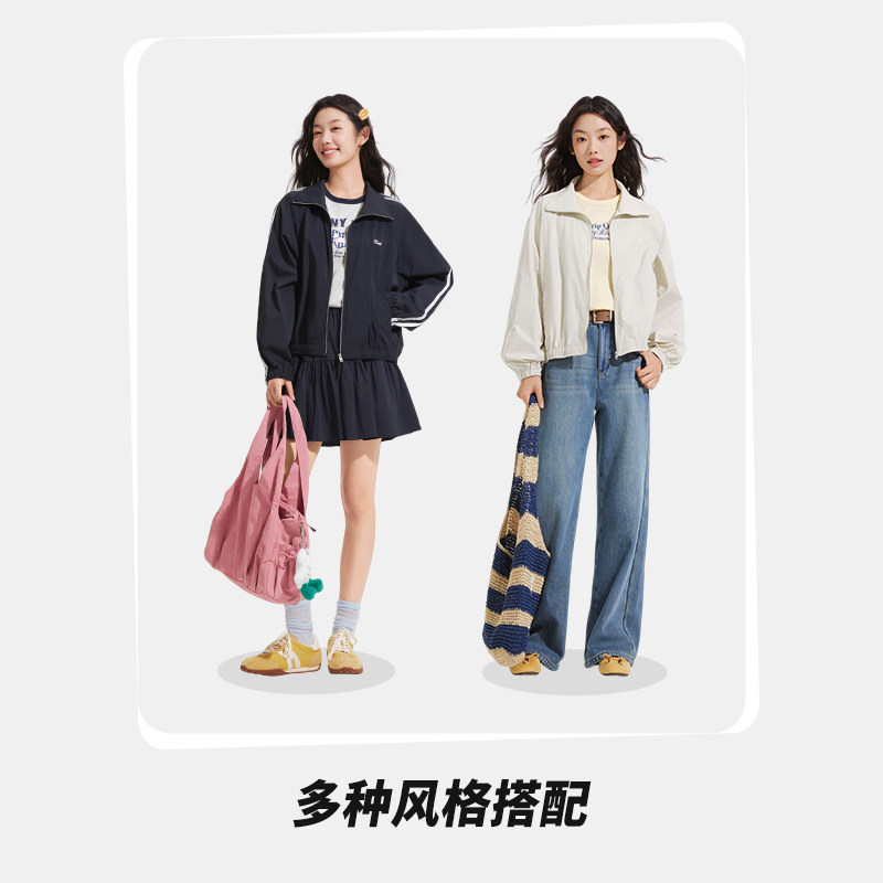 热风2026年夏季新款女士轻薄拼条夹克宽松型拉链短外套薄款