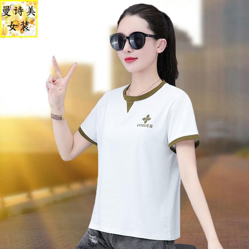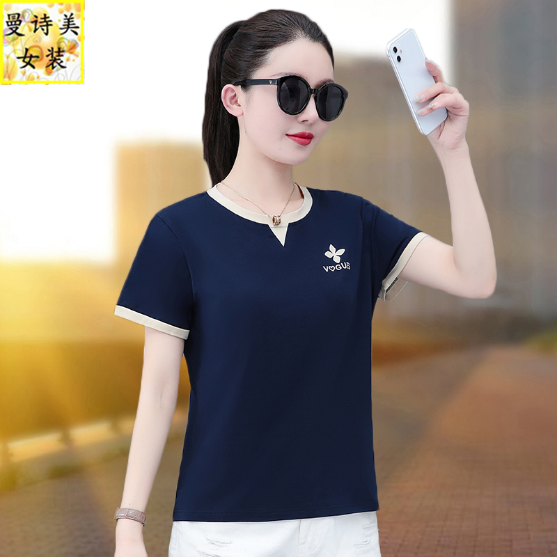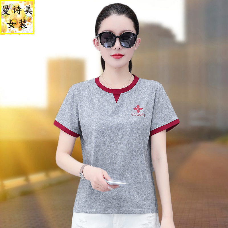 纯棉中年女士短袖t恤女夏季2025新款宽松休闲妈妈装圆领女式上衣