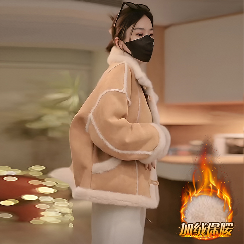 蓝色皮毛一体外套女冬季2025新款韩系羊羔毛机车服小个子短款棉衣