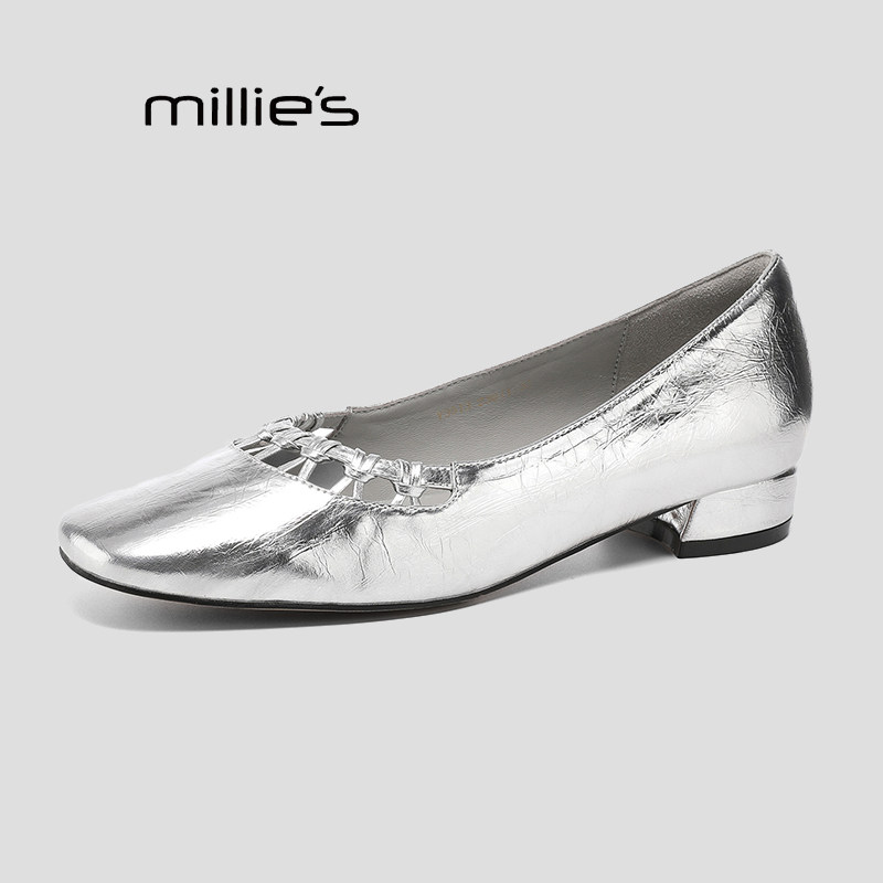 MILLIE'S/妙丽法式轻熟风银色浅口单鞋女春季一脚蹬通勤百搭低跟Q
