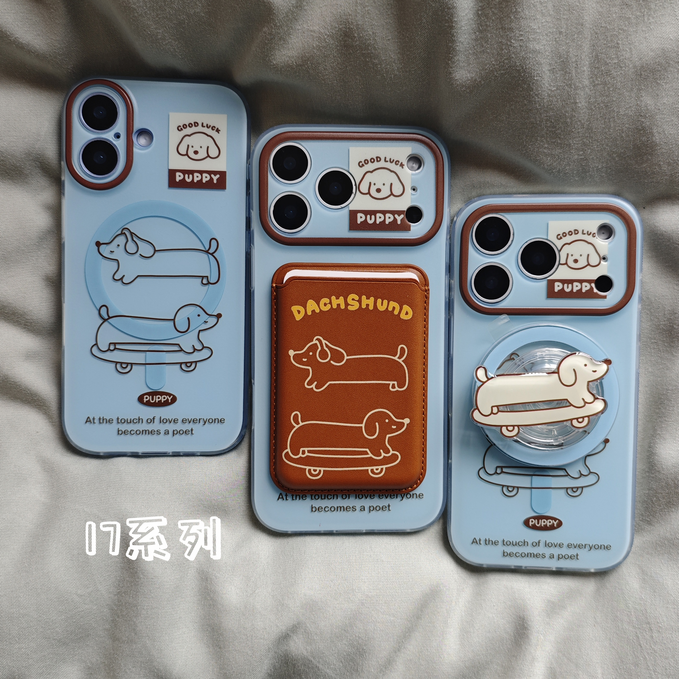 天蓝线条滑板腊肠狗磁吸双层imd手机壳适用iphone16promax防摔17苹果15支架14卡包男女小众清新13简约磨砂