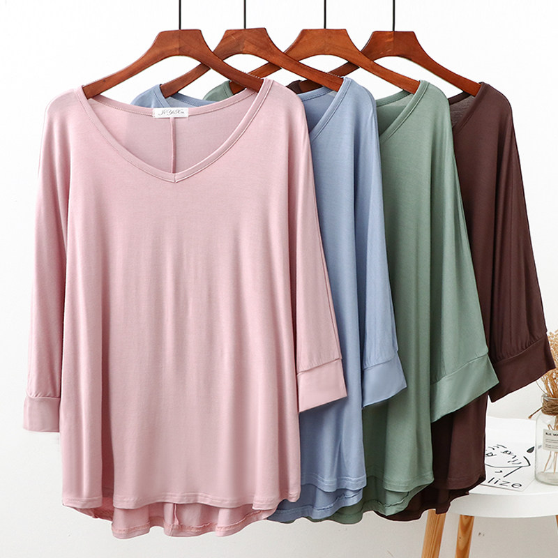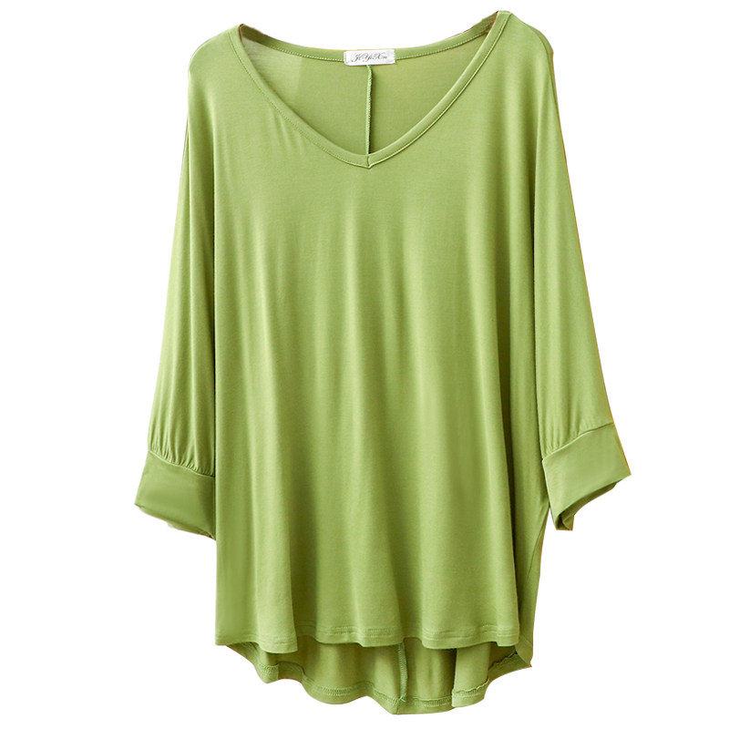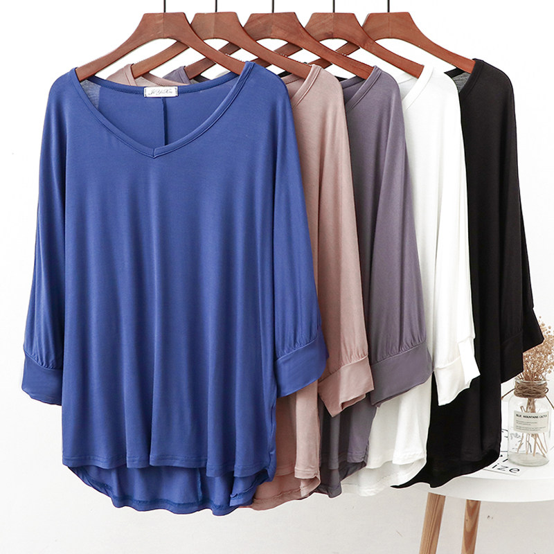 春夏薄款莫代尔七分袖T恤女纯色宽松大码中长款上衣韩版V领打底衫
