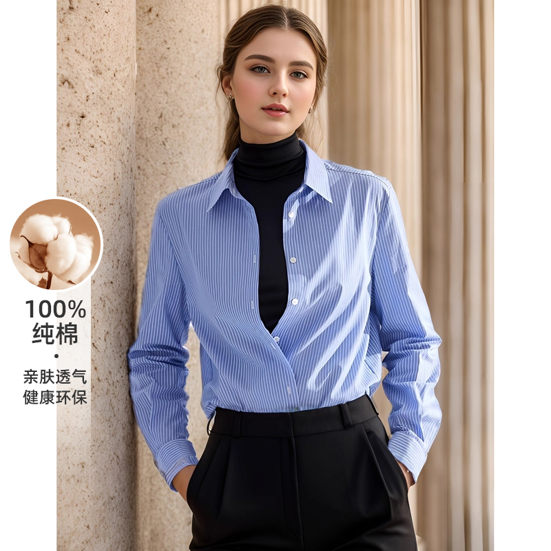 纯棉长袖衬衫女蓝白条纹通勤职业休闲宽松轻奢小众设计感气质衬衣