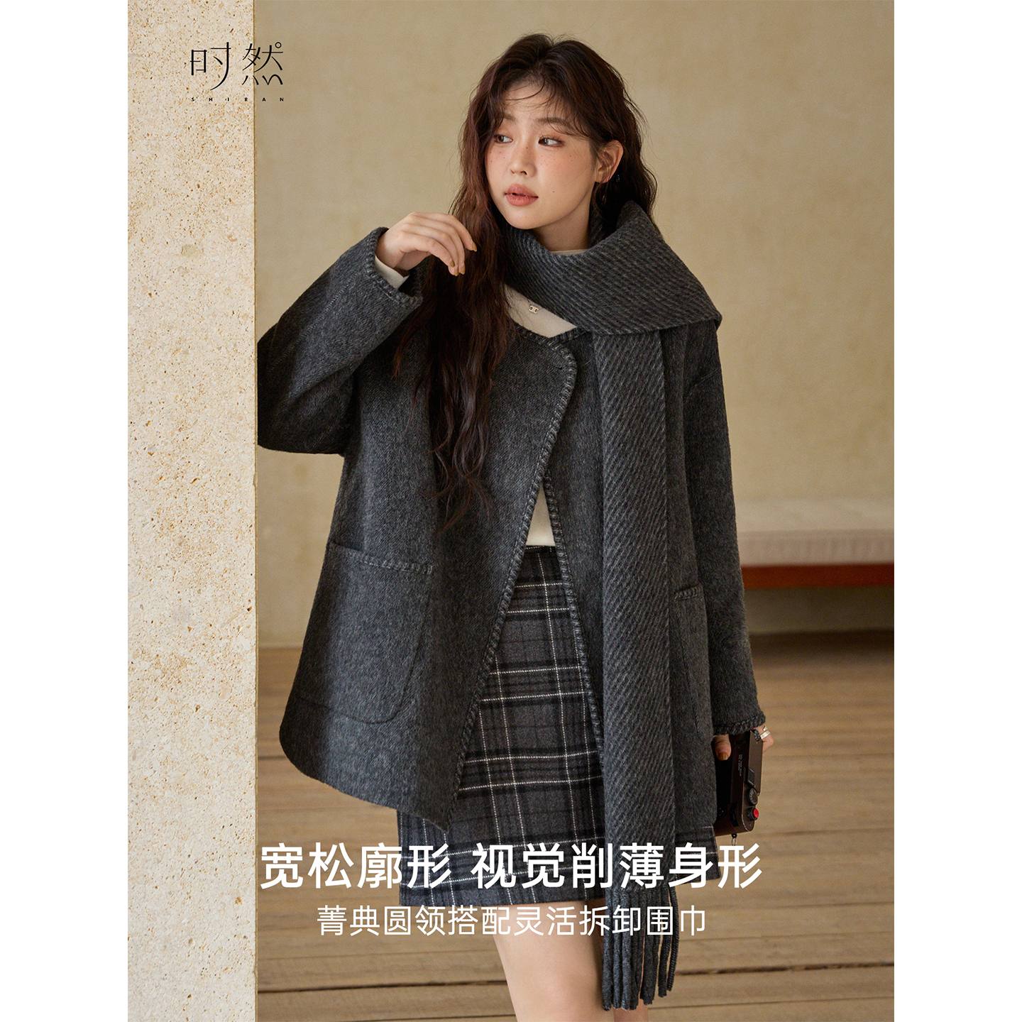 时然大码女装带围巾双面毛呢外套25秋冬胖mm显瘦格雷系羊毛大衣