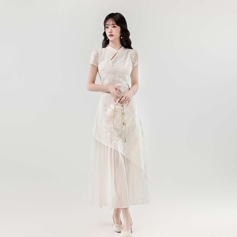 实拍2025夏季新款新中式温婉优雅杏色绣花不规则设计感长款连衣裙